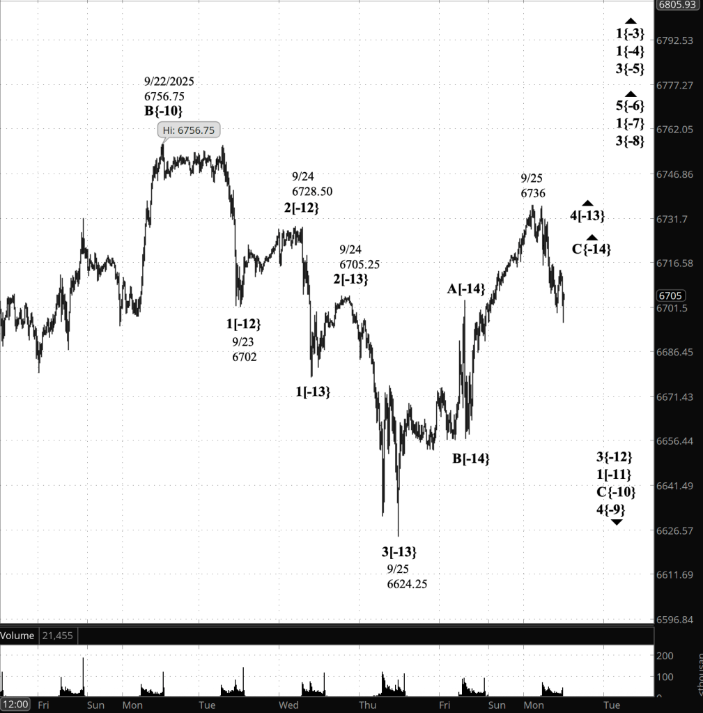 Elliott Wave Theory: The decline is not yet sufficient to declare an end of the 4th-wave upward correction that began on September 25 from 6654. So on the afternoon, as was the case in the morning chart, wave 4 is underway and within it wave C is nearings its end.