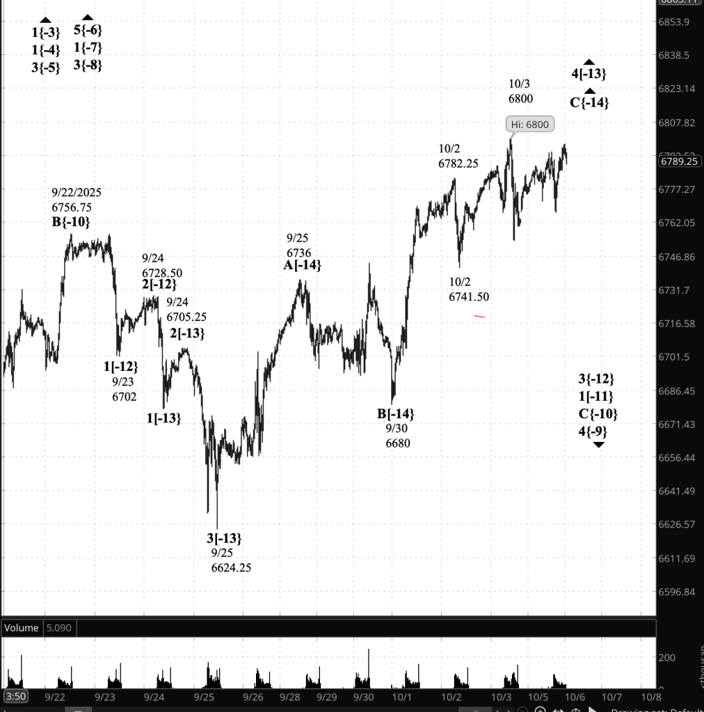 Half an hour before the closing bell. The S&P 500 futures dropped back into the 6760s during the session and then rose back into 6790s. This morning’s Elliott Wave Theory analysis is unchanged. Wave C within a 4th-wave upward correction continues and is the principal analysis, and the alternative says that wave C ended on October 3 at 6800.