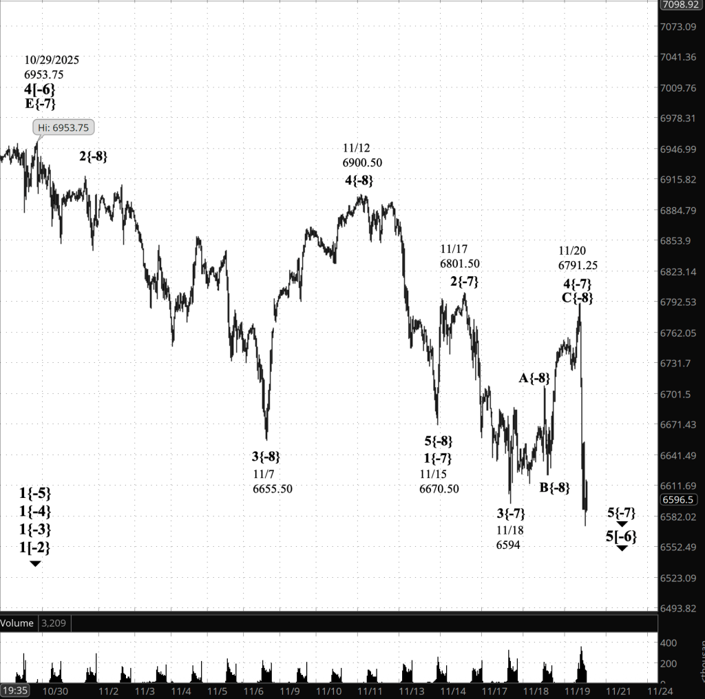 When wave 5{-7} ends, it will also be the end of wave 5{-6}, which began on October 29 from 6953.75. It will also be the end of downtrending wave 1{-5}, which began on October 8 from 6812.25.