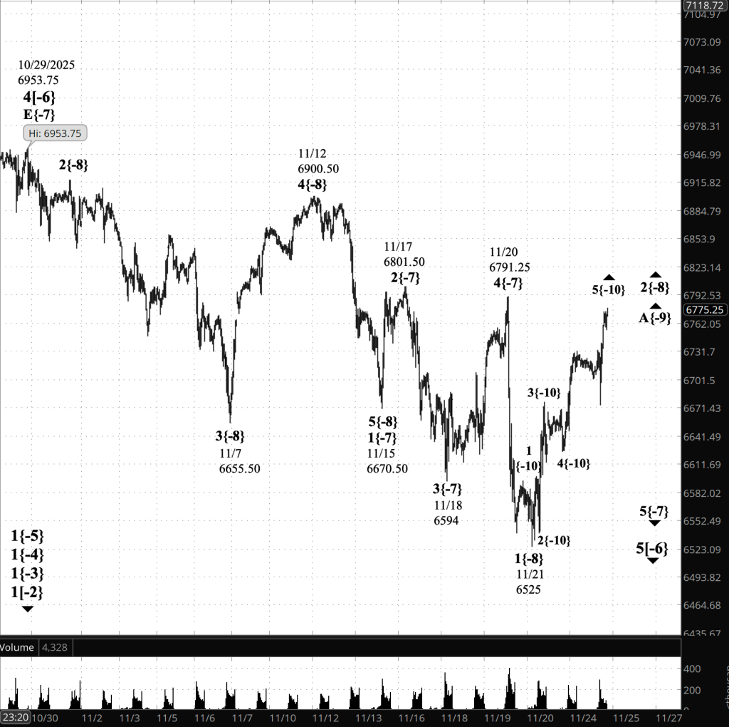 The likely Wave 2 end points of yesterday’s analysis remain unchanged: Wave 2{-8} is expected to complete below the start of the prior 1{-8}, 6791.25. That’s required by a rule of Elliott Wave Theory.