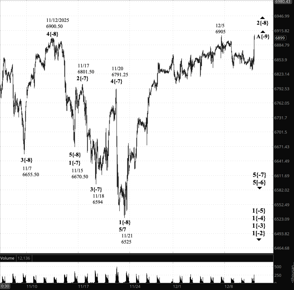 “Overnight the S&P 500 futures are still coiling in a tight pre-FOMC box (~6859–6834), which keeps the central question alive: was 6906 (12/5) the end of Wave A{-9}, meaning Wave B{-9} has begun? As long as price fails to reclaim 6859 with follow-through, the simplest read is that B{-9} is already in progress as a corrective/consolidative phase. To weaken that call, bulls need acceptance above ~6885 (nearest resistance shelf) and then a return to 6905–6906; a clean breakout above 6906 would argue that the correction is ending and the larger upward structure is reasserting itself. Until then, this looks like ‘marking time’ into the 2:00 p.m. ET FOMC catalyst rather than a resolved trend.”