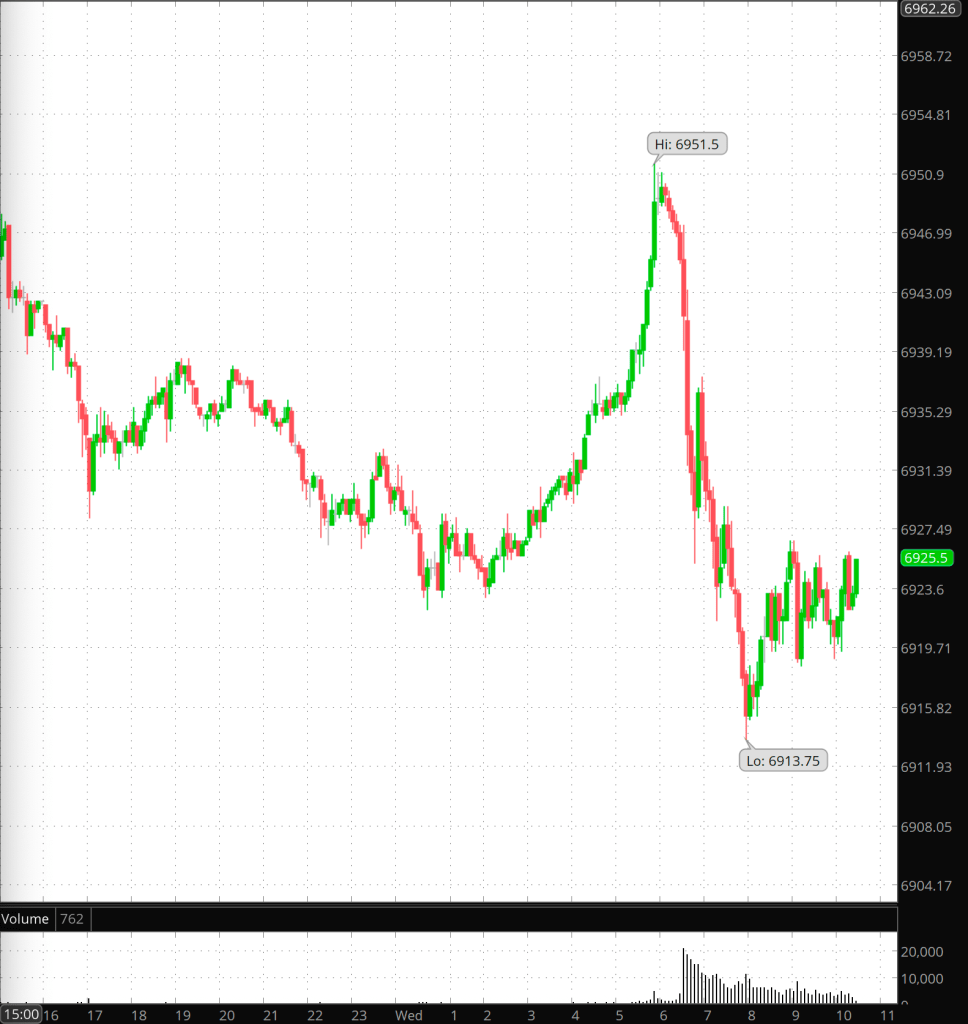 Half an hour before the closing bell. The S&P 500 E-mini futures reached a session low of 6913.75 and then rose modestly into the 6920s.