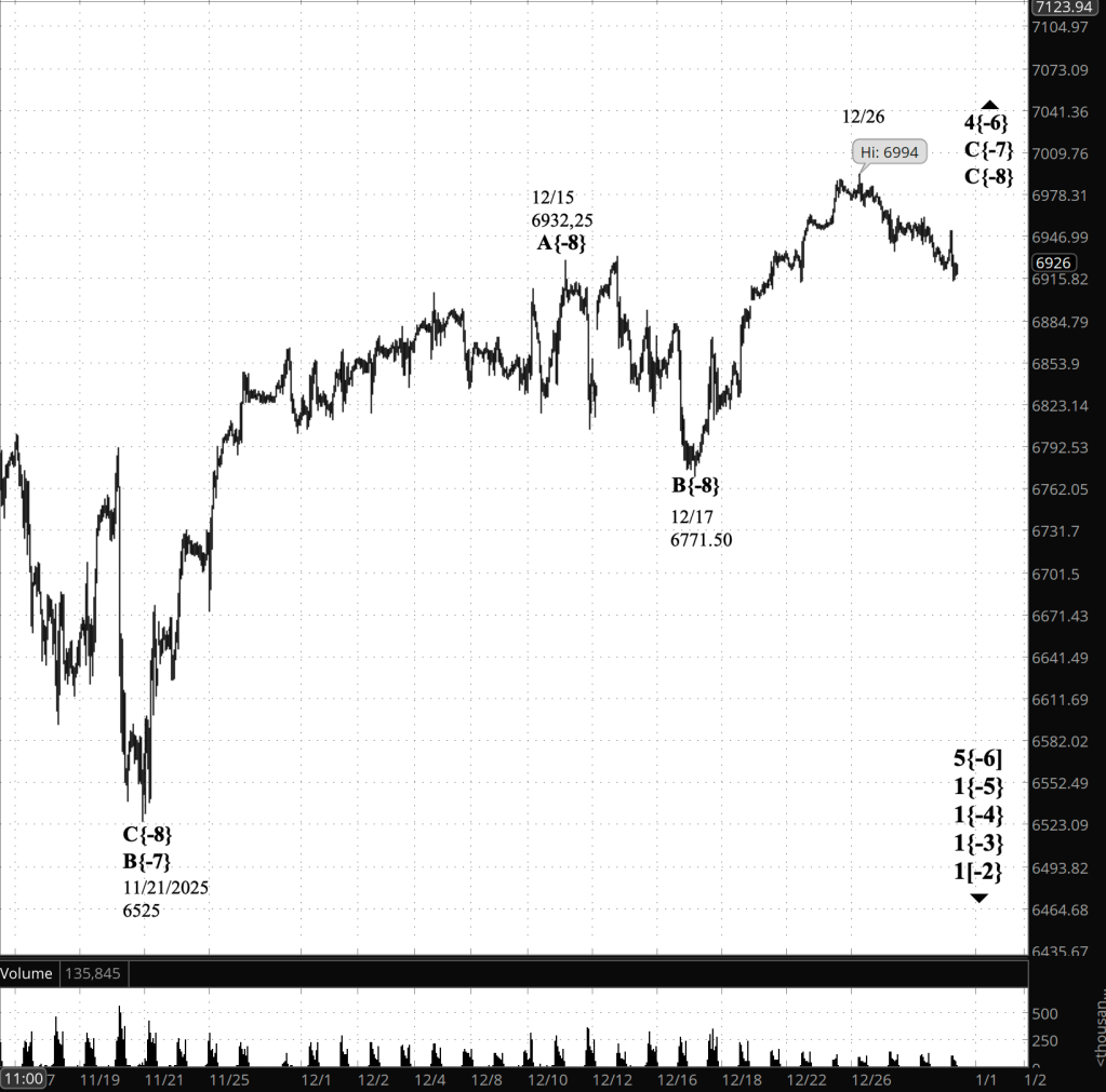 The prior peak was 6994. A rise back toward 6994 would favor the interpretation that wave 4{-6} is continuing. By contrast, continued weakness that remains below the 6978 area — and especially any decline that pushes lower from here — strengthens the argument that wave 5{-6} is underway.