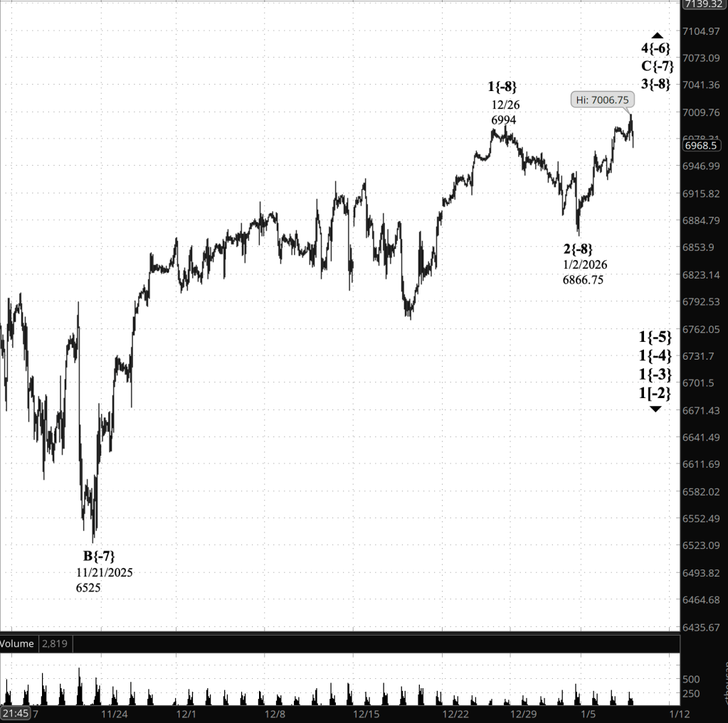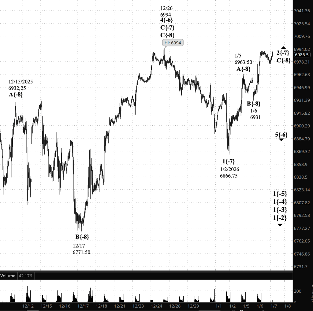 The larger structure still reads as: The December 26 peak at 6994 ended wave 4{-6}, and the decline into 1/2 at 6866.75 was wave 1{-7} of the new downtrend, 5{-6}. Since then we’ve been in the corrective rebound, wave 2{-7}, which is now in its final leg, wave C{-8} (with A{-8} = 6963.50 on 1/5 and B{-8} = 6931 on 1/6 already in place).