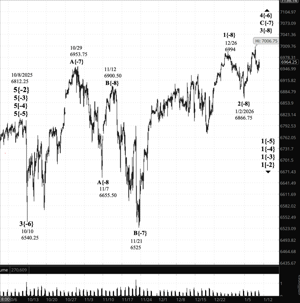 The entire structure remains within rising wave 4{-6}, the upward correction that started on October 10, 2025 at 6540.25. Wave 4{-6} appears to be taking the form of an expanding diagonal triangle.