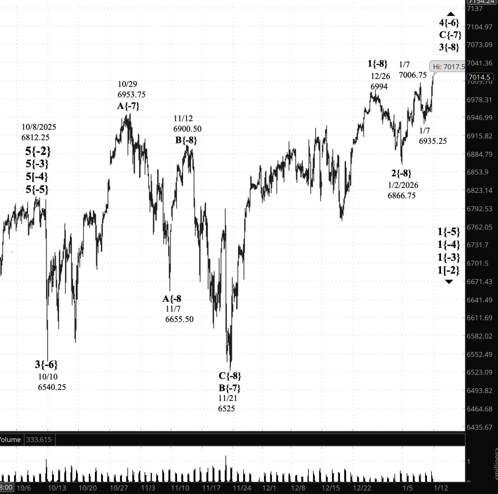 What does it mean? Notably, in terms of Elliott Wave Theory, the futures’ positive response to the jobs report fell short of the peak of wave 3{-8} so far, 7006.75 reached on January 7. The price might well reach that high point again, or perhaps exceed it. But that hasn’t happened yet, and the market response was a happy pop but not an overwhelming one.