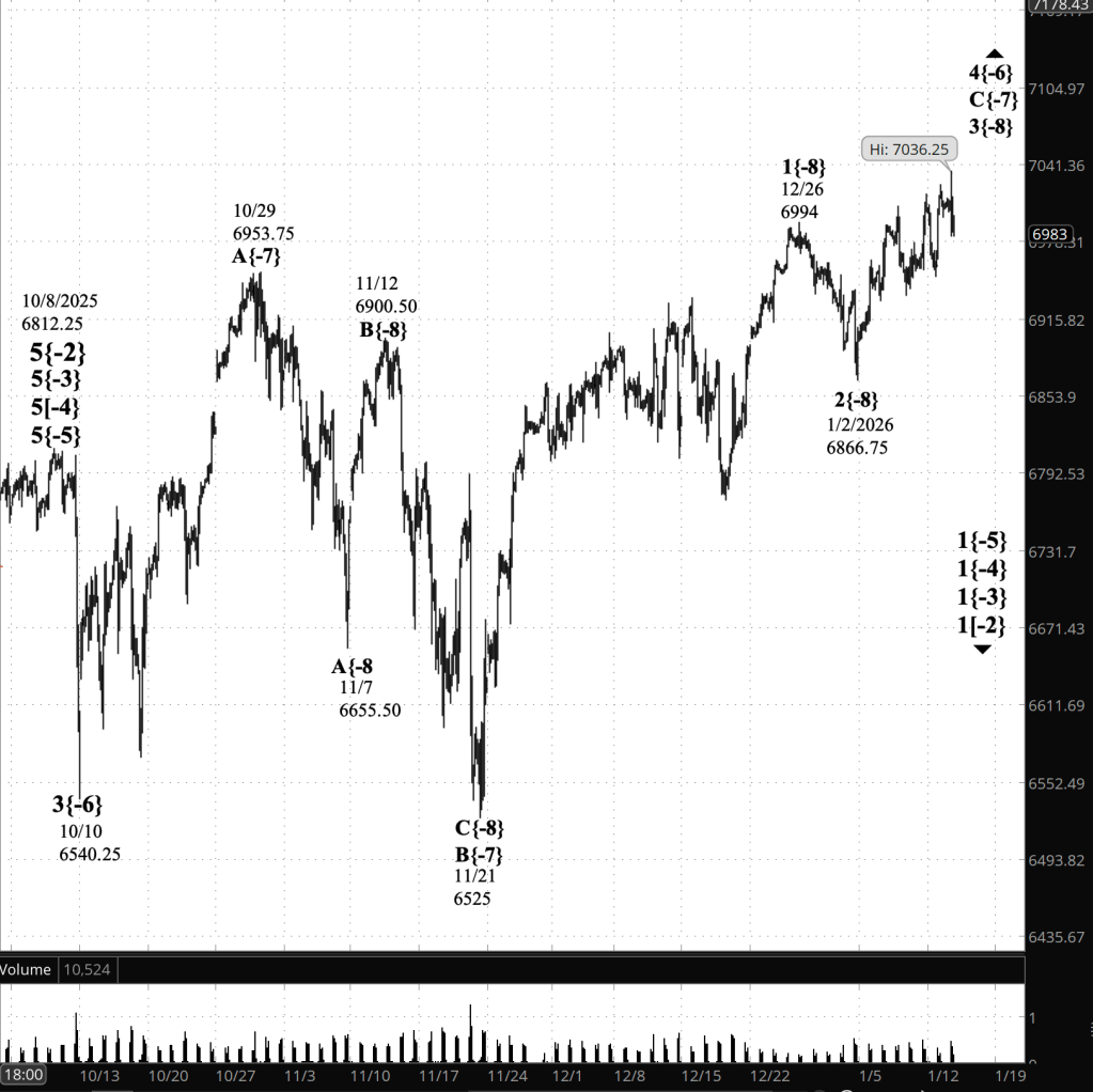 Key level. The pre-CPI base at 7007–7010 has now been broken. If price can reclaim that range and hold, the larger uptrend remains the higher-probability conclusion. If it cannot, then the odds increase that today’s decline is more than a brief subwave and may be the start of a deeper pullback.
