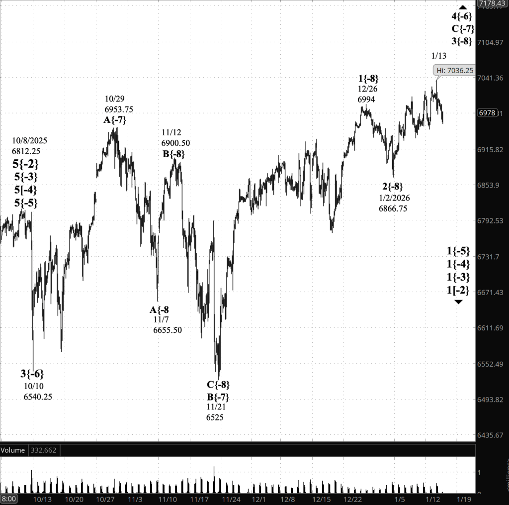 One degree lower is where the uncertainty begins. Rising wave 3{-8} began on January 2 at 6866.75 and peaked on January 13 at 7036.25. If that peak was the end of wave 3{-8}, then declining wave 4{-8} is now the next expectation. The first warning sign would be continued weakness that fails to reclaim 6994 on any bounce. A decline below 6971.50 (38% retracement of the January 2–January 13 rise) would further support that view; below 6951.50 (50%) would make it the working assumption; and below 6931.50 (62%) would strongly favor that wave 4{-8} is underway.