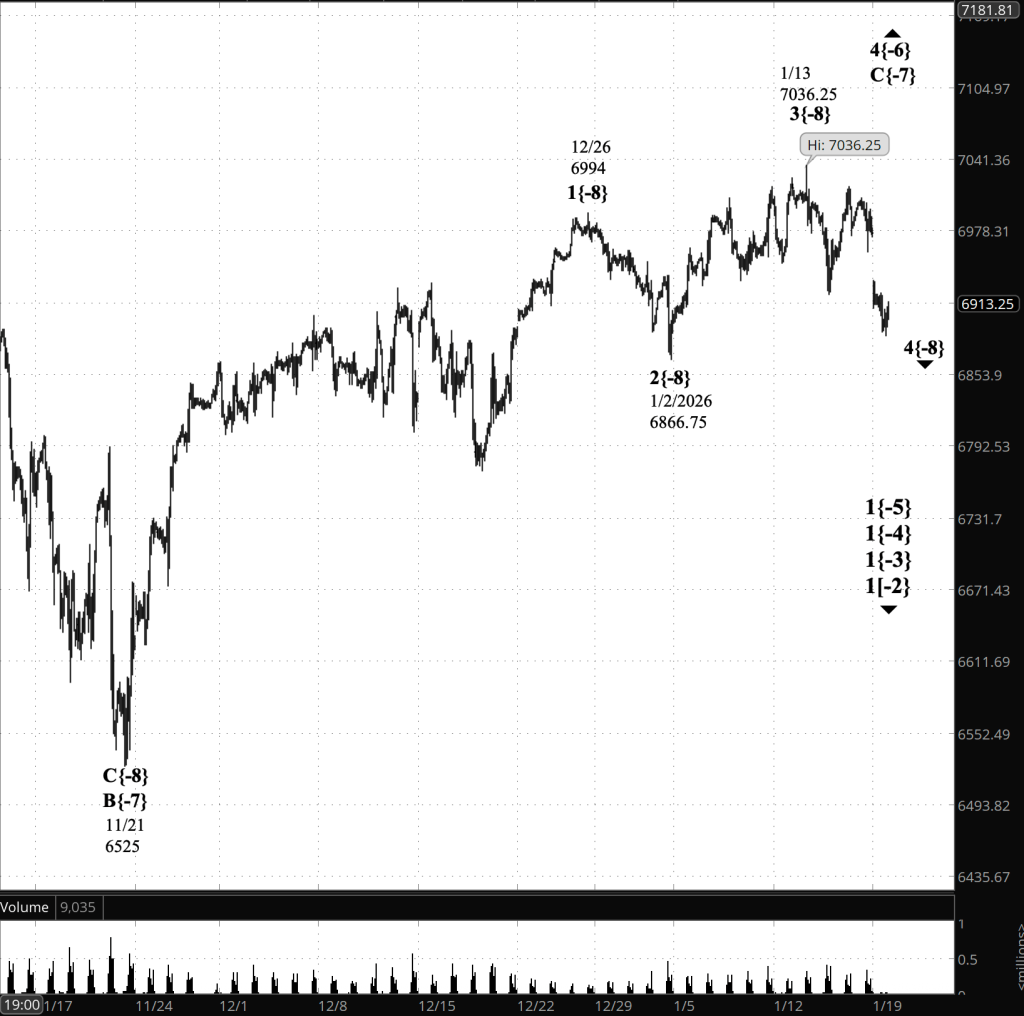 The analysis on Friday, based on Fibonacci levels and wave lengths within the structure, had determend that a move below 6923.25 would be confirmation that wave 4{-8} is underway. The chart as of this writing is 33 points below that level.