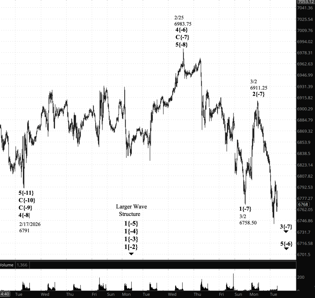 Degree note. There is still ambiguity about whether today’s selloff is labeled 3{-7} (one degree below 5{-6}) or a smaller-degree 3{-8} within 1{-7}. For now, that ambiguity does not change the trading read: the tape remains bearish until price proves otherwise.