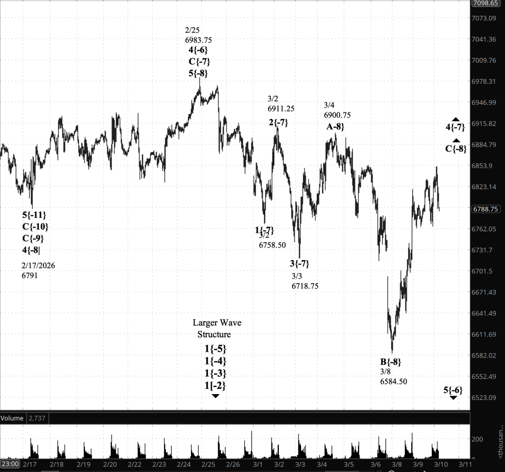 Elliott Wave Theory: Rising wave C{-8}, the final subwave within the upward correction labeled as wave 4{-7}, is still underway. Both waves are subwaves within the larger decline, wave 5{-6}, which began on February 25 from 6983.75.