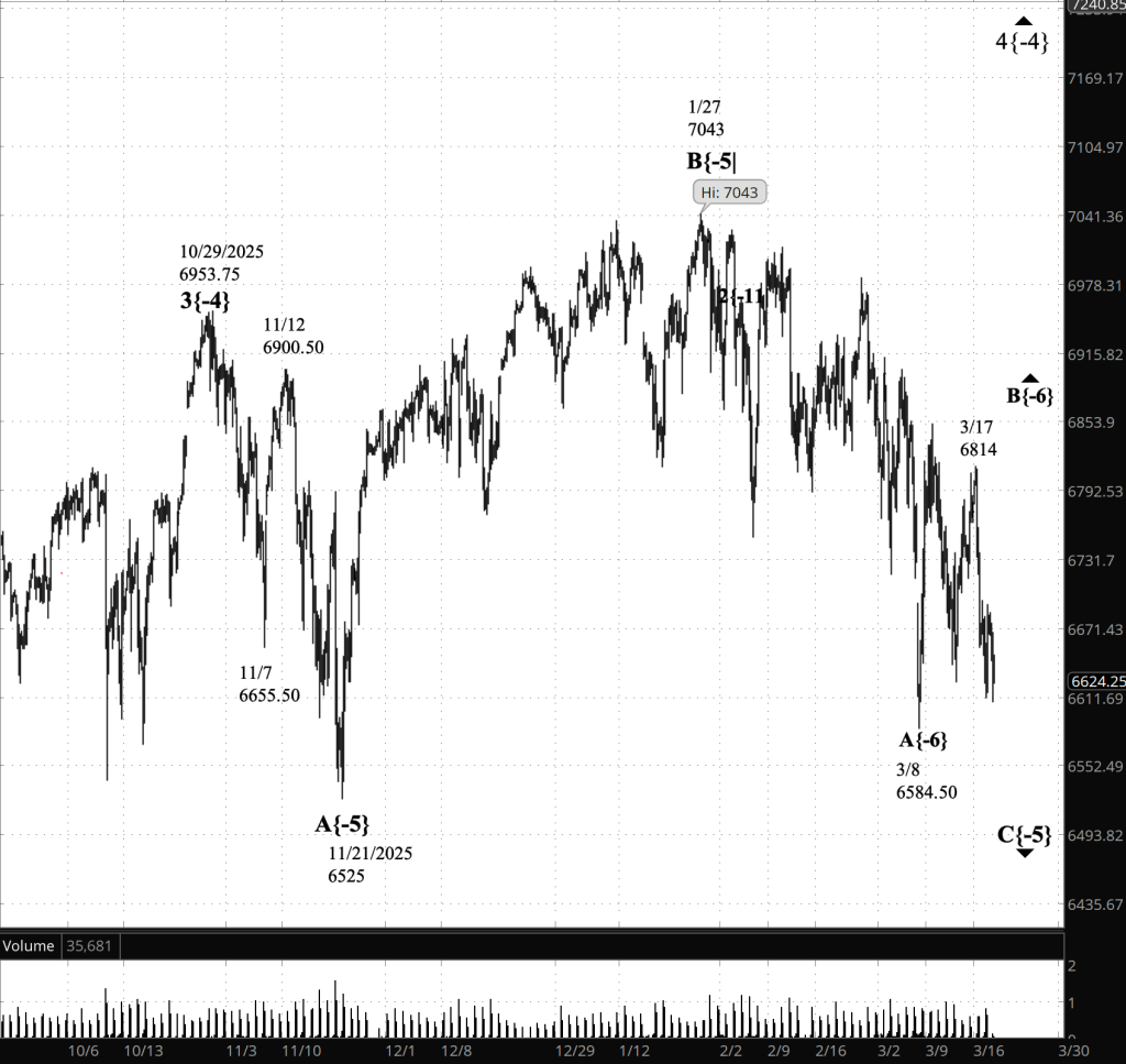 The initial phase of this decline appears to have ended on March 8 at 6584.50, marking the completion of wave A{-6}. Price behavior since that date is interpreted as the development of wave B{-6}, a corrective advance that may still be unfolding. The choppy, overlapping swings seen in recent sessions are consistent with the internal complexity typically associated with B-waves at this degree.