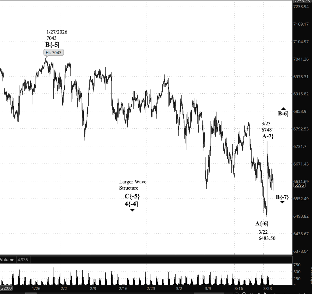 The labeling used here instead treats A{-6} as ending on March 22 and sees rising wave B{-6} as still underway. The sharp one-day advance is counted as subwave A{-7}, with wave B{-7} now in progress.