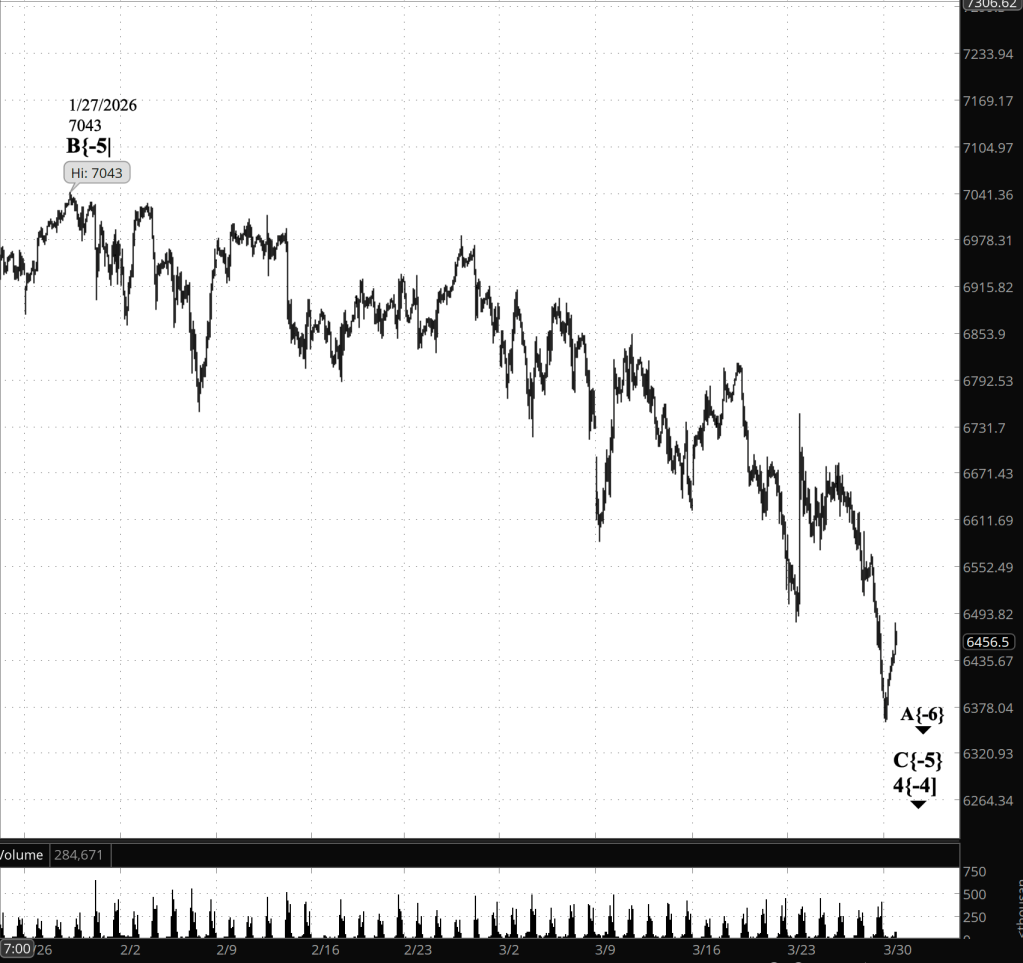 The principal analysis remains in place: Wave A{-6} is underway, with the overnight rally representing a smaller-degree countertrend move within it. Under this view, one more downward leg—likely completing the internal structure of A{-6}—remains to be seen before a durable countertrend rally in wave B{-6} begins.