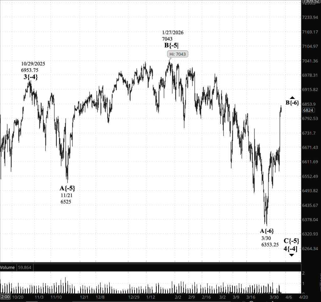 Decision Points. The key question is whether rising wave B{-6} has completed its final subwave, C{-7}. The current rally has reached the mid-6800s, placing it within the expected resistance zone for B{-6}, roughly 6620–6680 and extending higher as momentum carried beyond the initial target. A continued hold above 6800, followed by a push to new recovery highs, would argue that C{-7} is still extending and that B{-6} is not yet complete. Conversely, a decisive break below 6760 would be the first signal that upward momentum has failed. A further decline below 6652.25, the overnight low, would strongly suggest that B{-6} has ended and that declining wave C{-6} is underway. Until that lower boundary is broken, the upward structure of B{-6} remains intact, but the risk of reversal is elevated given the maturity of the move.