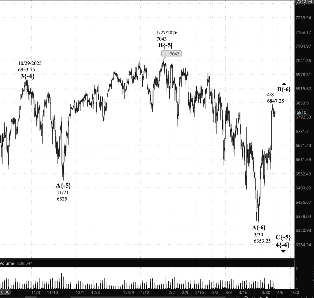 Rising wave B{-6} is a subwave within declining wave C{-5}, which in turn is a subwave within corrective wave 4{-4}. That larger correction, which began on October 29, 2025, appears to be taking the form of an expanding triangle. The 4-hour futures chart below shows wave 4{-4} in its entirety from that starting point.