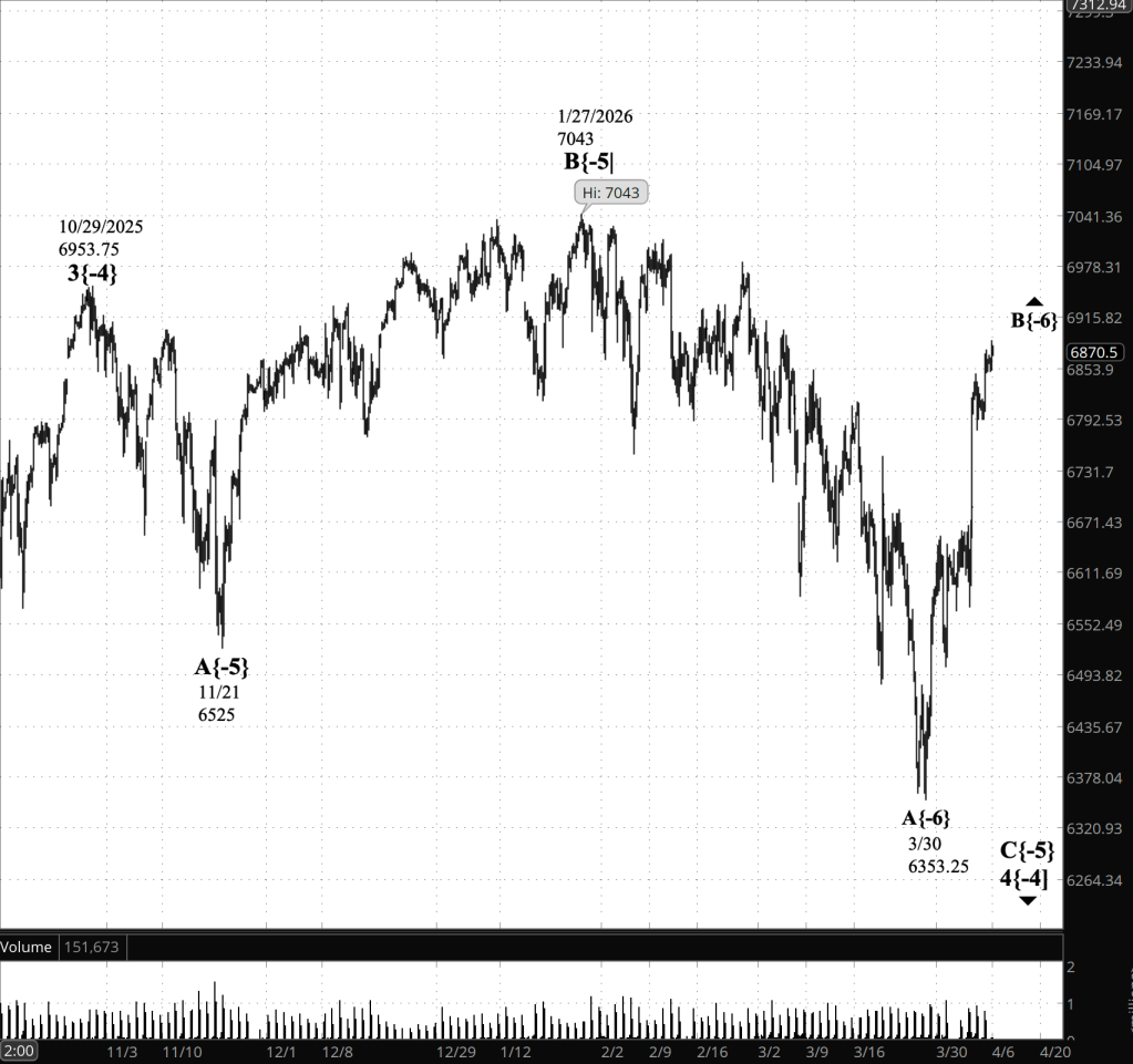 Decision Points. The immediate resistance zone remains the CPI spike high at 6888; a sustained move above that level would support further extension of wave B{-6}. On the downside, support lies in the 6840–6850 range, which has contained the post-release pullback; a break below that zone would signal that the upward correction is weakening. A decline through 6780 would shift the balance toward the start of declining wave C{-6}.