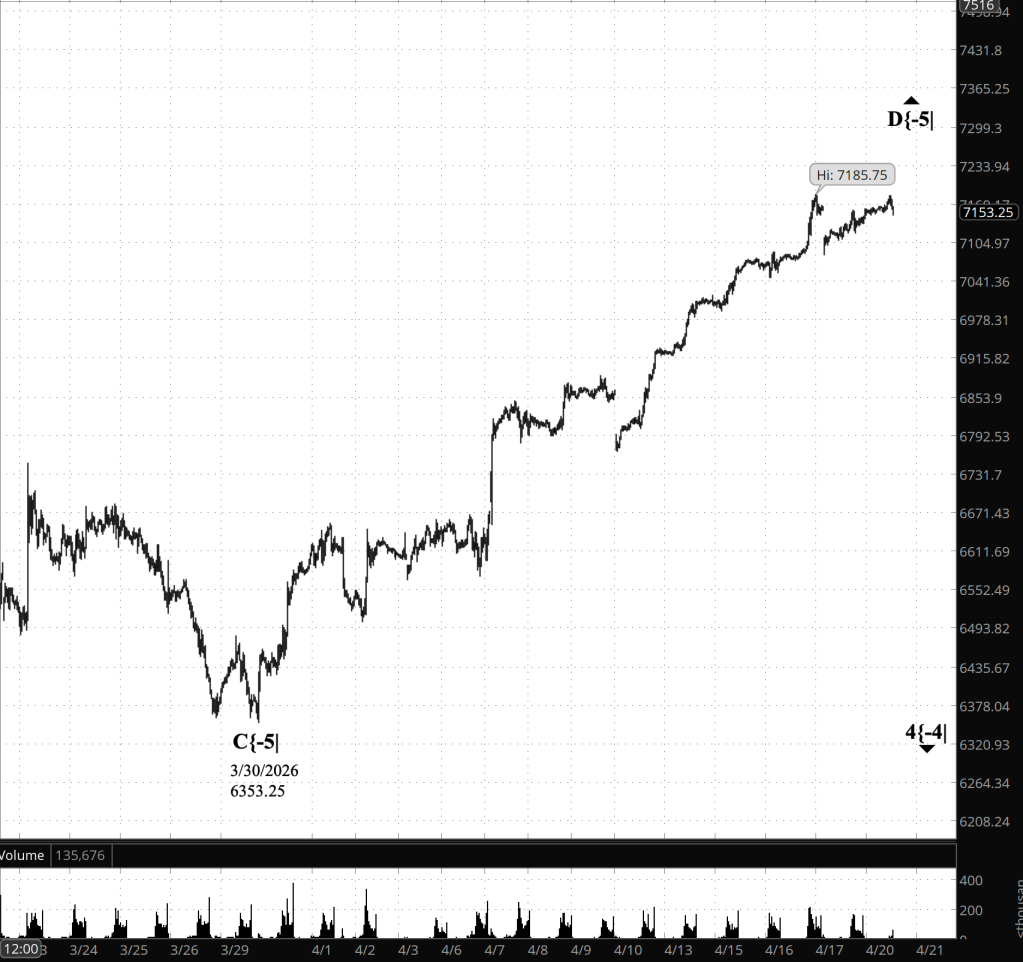 Decision Points. A move above 7185.75 would confirm that wave D{-5} continues to rise and allow for further, likely limited, gains. Repeated failure in the 7180–7185 range would suggest that the wave is nearing completion. A decline below 7145–7150 would provide the first indication that wave E{-5} to the downside may be underway, with a break below 7100 offering stronger confirmation that the trend has turned.