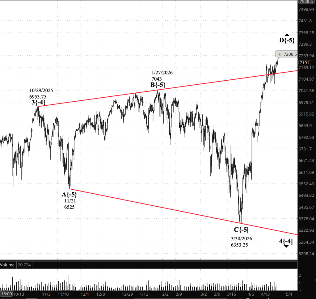 Decision Points. A move above 7208.50 would extend wave D{-5} and keep upward pressure in place. Continued trade in the 7180s and 7190s would leave the market in a waiting pattern, still above the triangle boundary but not yet breaking decisively free. A decline back below the upper boundary, now roughly in the upper 7160s to low 7170s, would be the first sign that D{-5} may have ended and that declining wave E{-5} may be beginning.