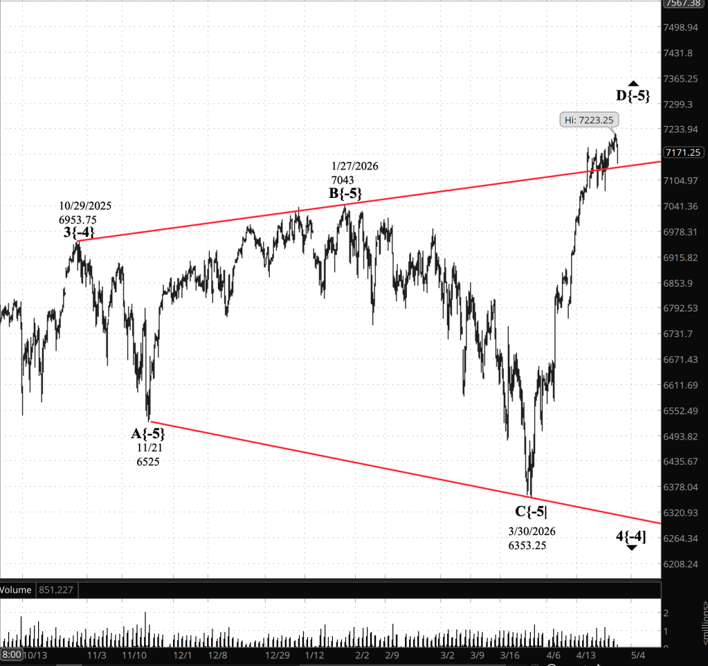 On the upside, a move back above 7185 would weaken the bearish case, and a rise above 7223.25 would show that wave D{-5} is still extending. Until one of those tests is resolved, the market remains in the same ambiguity that has defined the structure since mid-April: wave D{-5} may still be pushing higher, but it is doing so at the point where the triangle pattern normally begins to look for a turn.