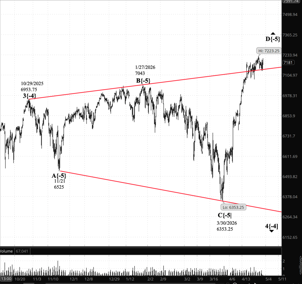 Decision Points. A sustained move above 7223.25, yesterday’s high, would strengthen the case that wave D{-5} is still rising. A decline below 7131.25 would weaken that case and suggest that wave E{-5} may already be underway. Between those levels, the map remains unchanged: wave D{-5} is still the working count, but the futures are testing whether the upper boundary has become support or remains resistance.