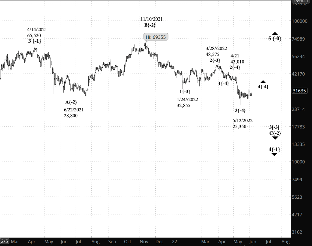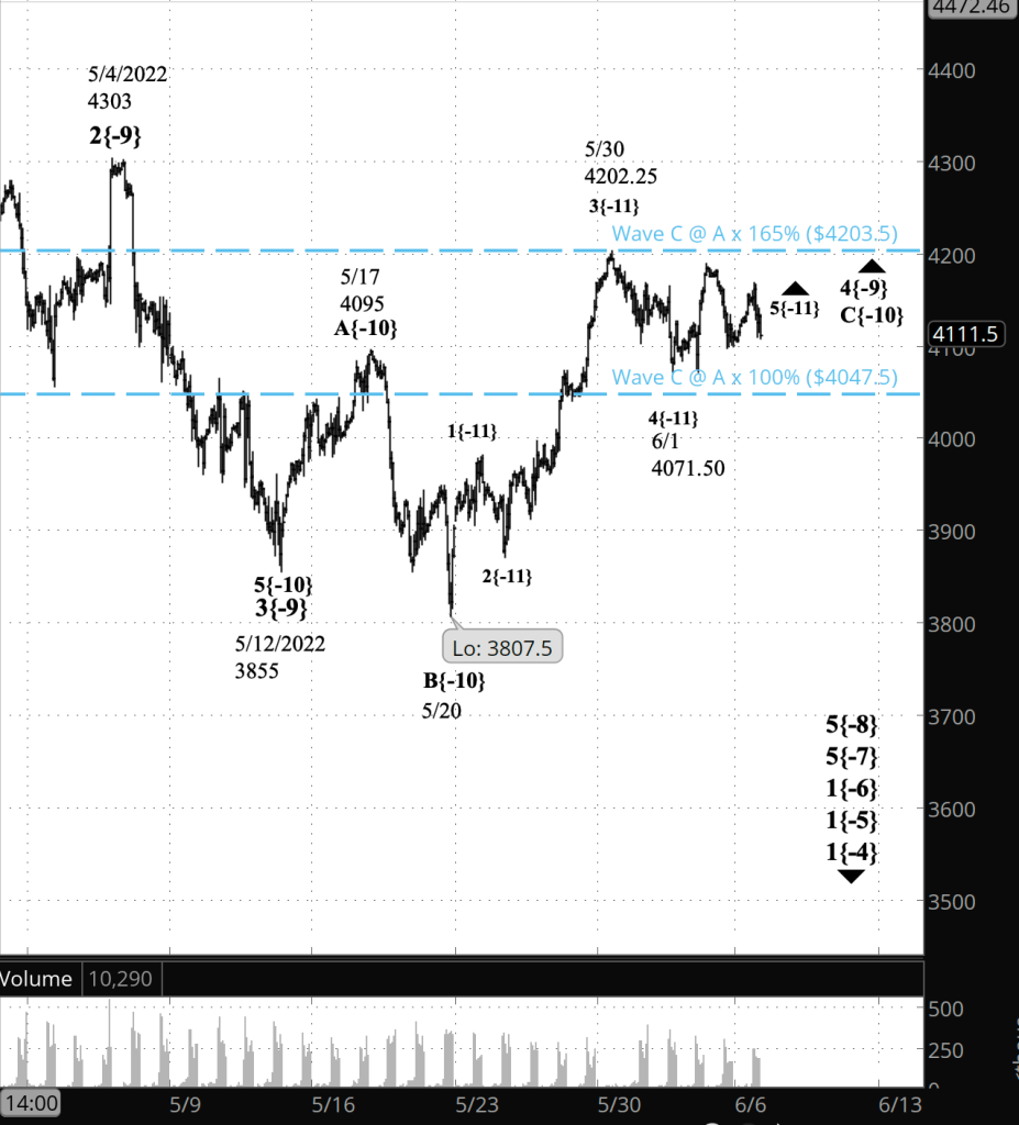The power of the wave 3{-10} decline is such that the wave count internally has ambiguities. It’s possible that any pause, such as the one overnight, marks a transition to wave 4{-10}, an upward correction, and then perhaps a decline, wave 5{-10}, whose completion will mark the end of wave 4{-9}. I intend to retain the present analysis until there’s a clear sign that wave 4{-10} has begun.