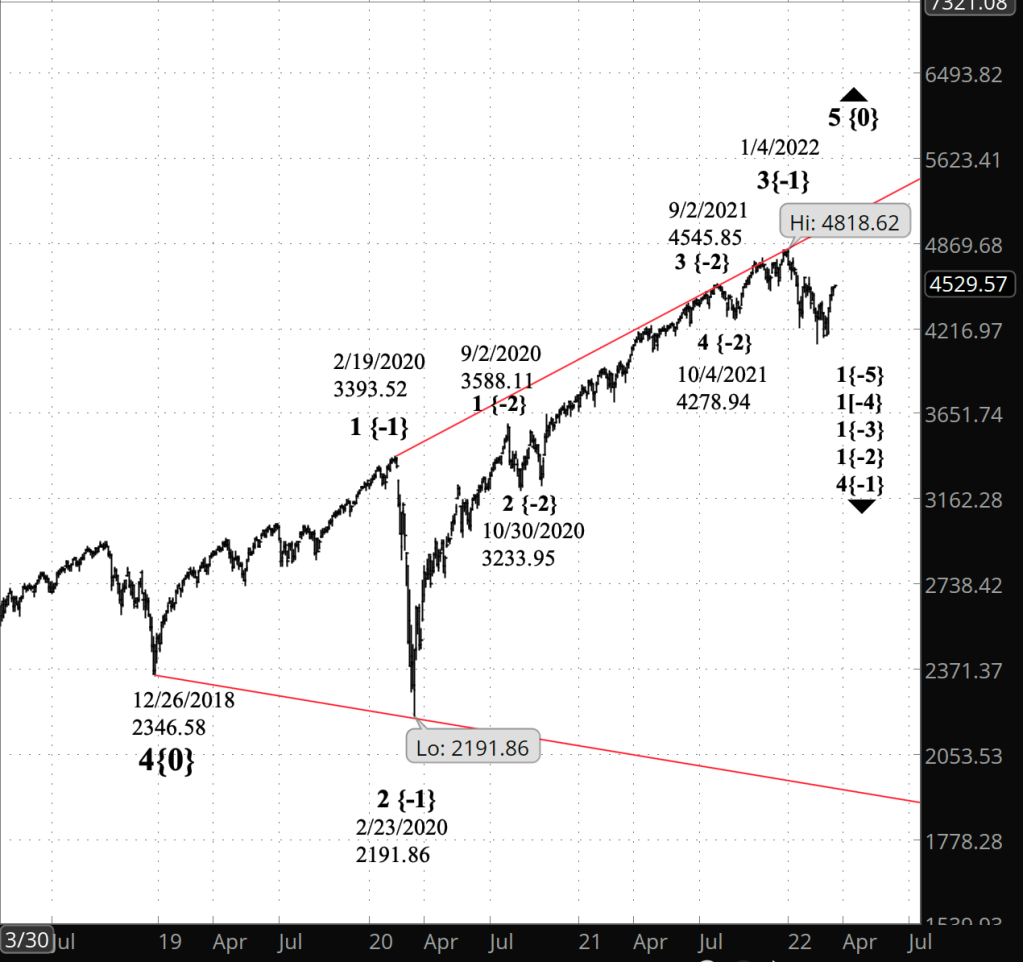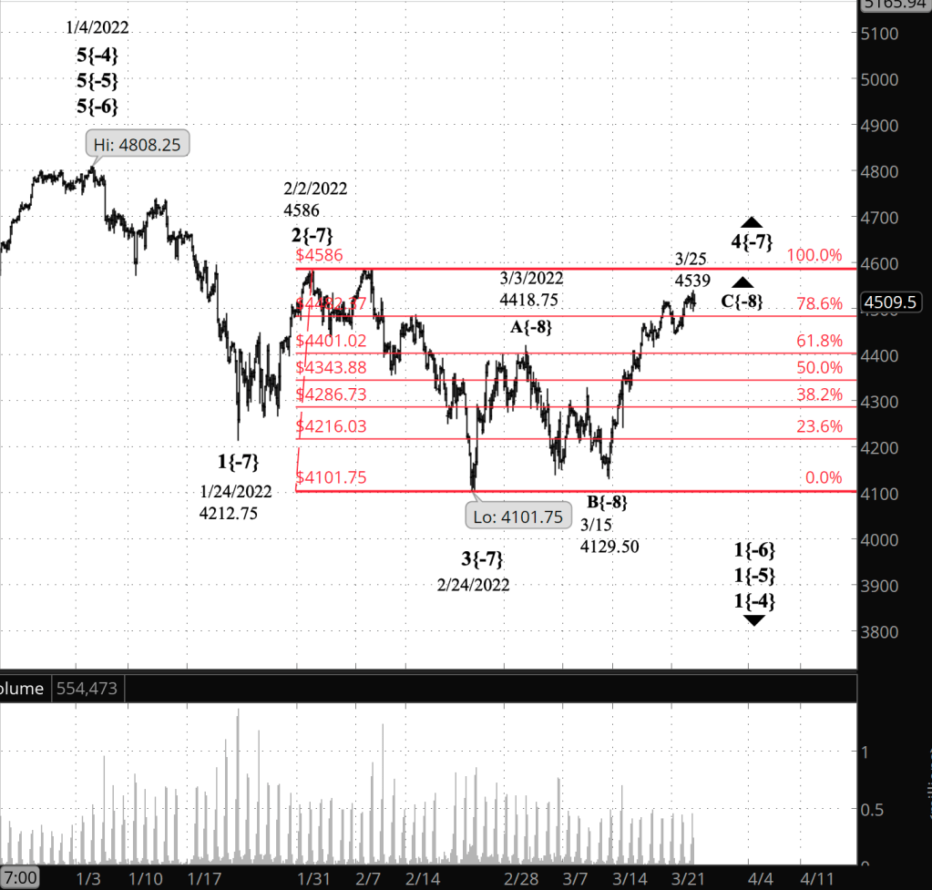 What does Elliott wave theory say? The question with the upward correction, wave 4{-7}, at this point is boundaries. The wave’s overnight high retraced 100% of the preceding wave 3{-7} — the 4586 mark.