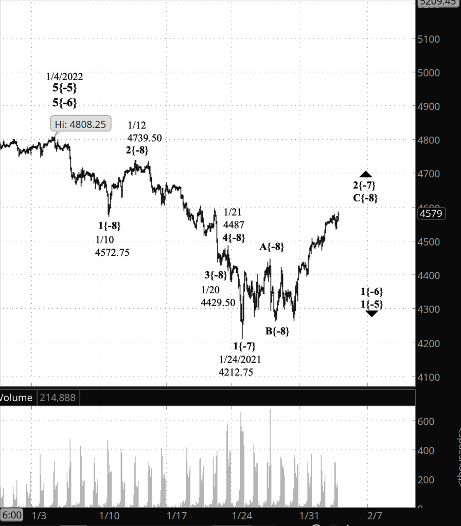 What does it mean? I’m sticking with yesterday’s principal analysis, but with declining confidence: The upward correction that began on January 24 from 4212.75 continues. It is in its last leg, and when it is complete, the downtrend that began on January 4 from 4808.25 will resume.