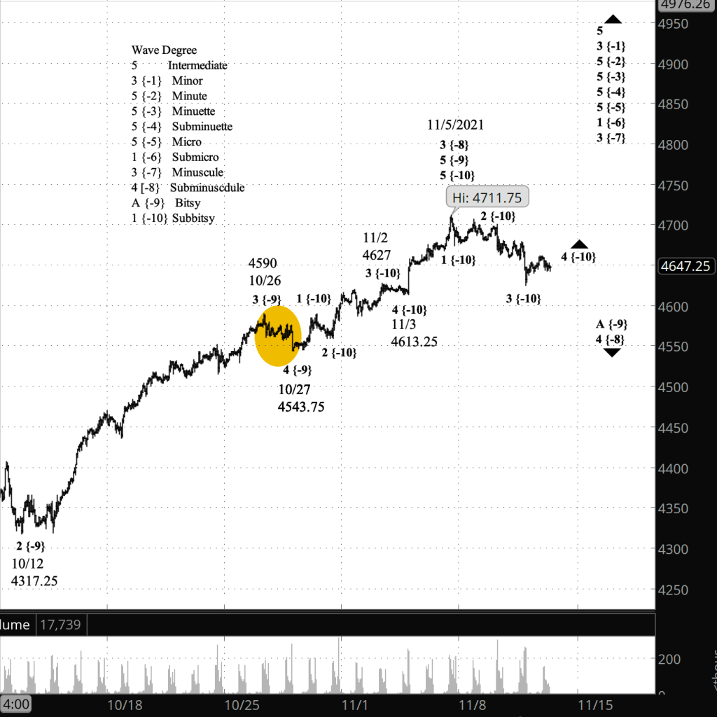 What does Elliott wave theory say? Under my principal analysis, the sideways movement is an early stage of wave 5 of Subbitsy degree — a {-10} subscript on the chart — which is the final, declining portion of wave A of Bitsy degree {-9} within a wave 4 correction of Subminuscule degree {-8}. Bitsy wave A will be followed by a rising B wave that may again reach into the 4690s, and then by declining C wave that will complete Subminuscule wave 4. That 4th wave will be followed by Subminuscule wave 5, which will push above the November 5 peak to new heights.