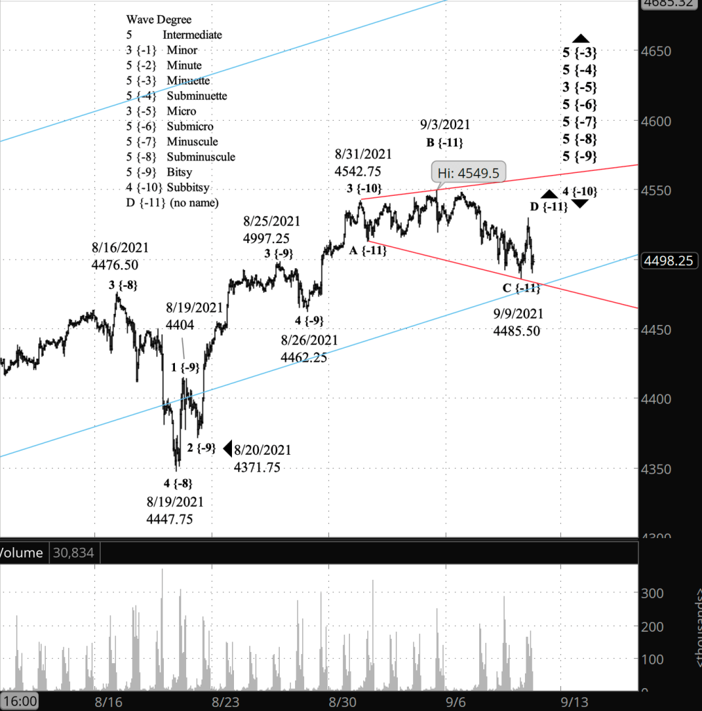 What does Elliott wave theory say? In the near-term, there is no change to my analysis posted yesterday, to which I refer you. The futures price has remained above 4425.25 — the low of September 14 — and below the high set on Wednesday, 4478.15.