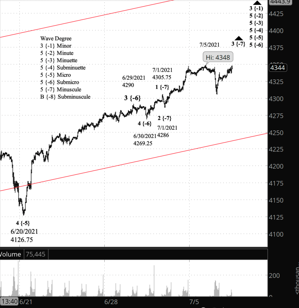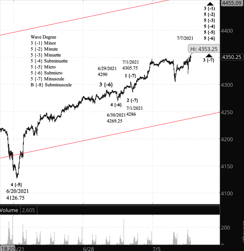 Another consideration is that the price is some distance below the upper boundary of the price channel of the degree above Micro, the Subminuette degree. In theory, the price should come close to that upper boundary, which is presently just below 4500 and rising.