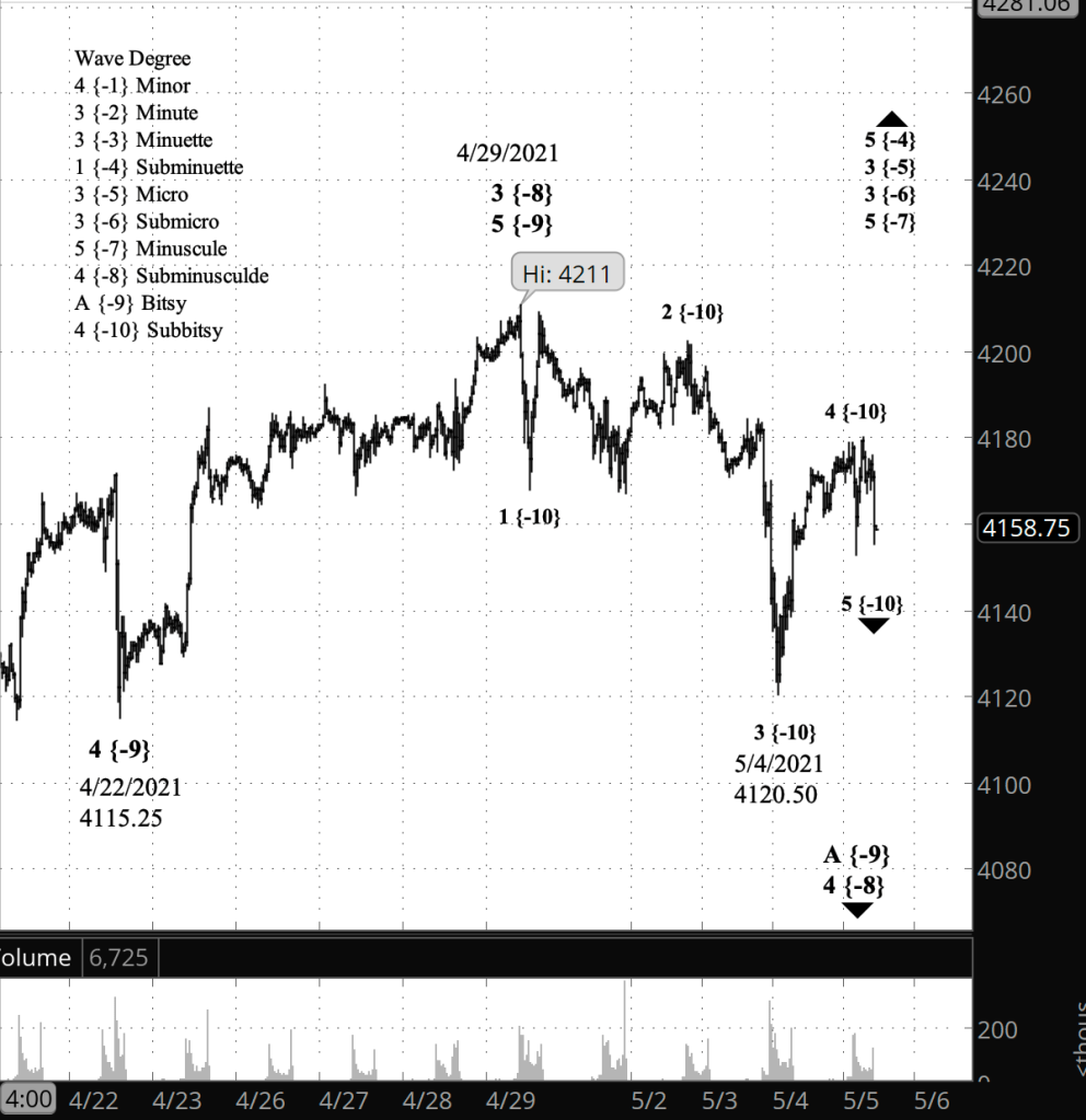 What does Elliott wave theory say? The high of 4211 on April 29 marked the end of wave 3 of Subminuscule degree and the beginning of a 4th wave correction. The correction took the form of three waves, each with three waves internally, making it a Flat pattern that ended on May 4 at 4120.50. The subsequent wave 5 of Subminuscule degree began and has so far carried the price to a high this morning of 4228.25 and climbing.