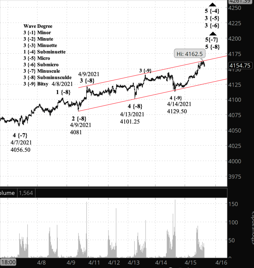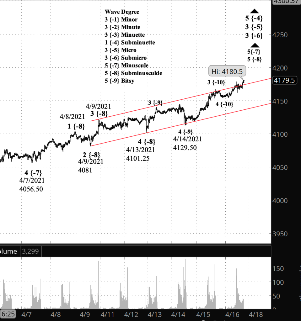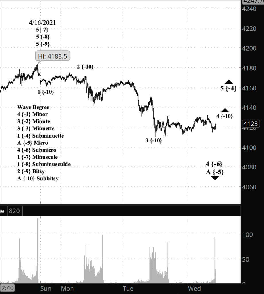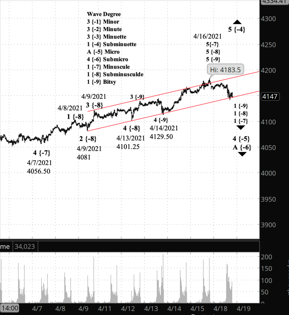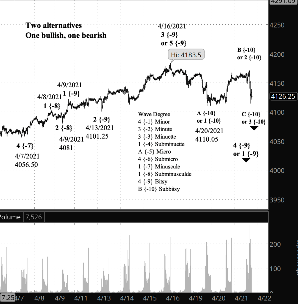 If the price moves above the peak of April 16 (4183.50 on the futures, 4191.31 on the index), and if the rise from April 20 has three waves internally, then the bullish scenario is correct.