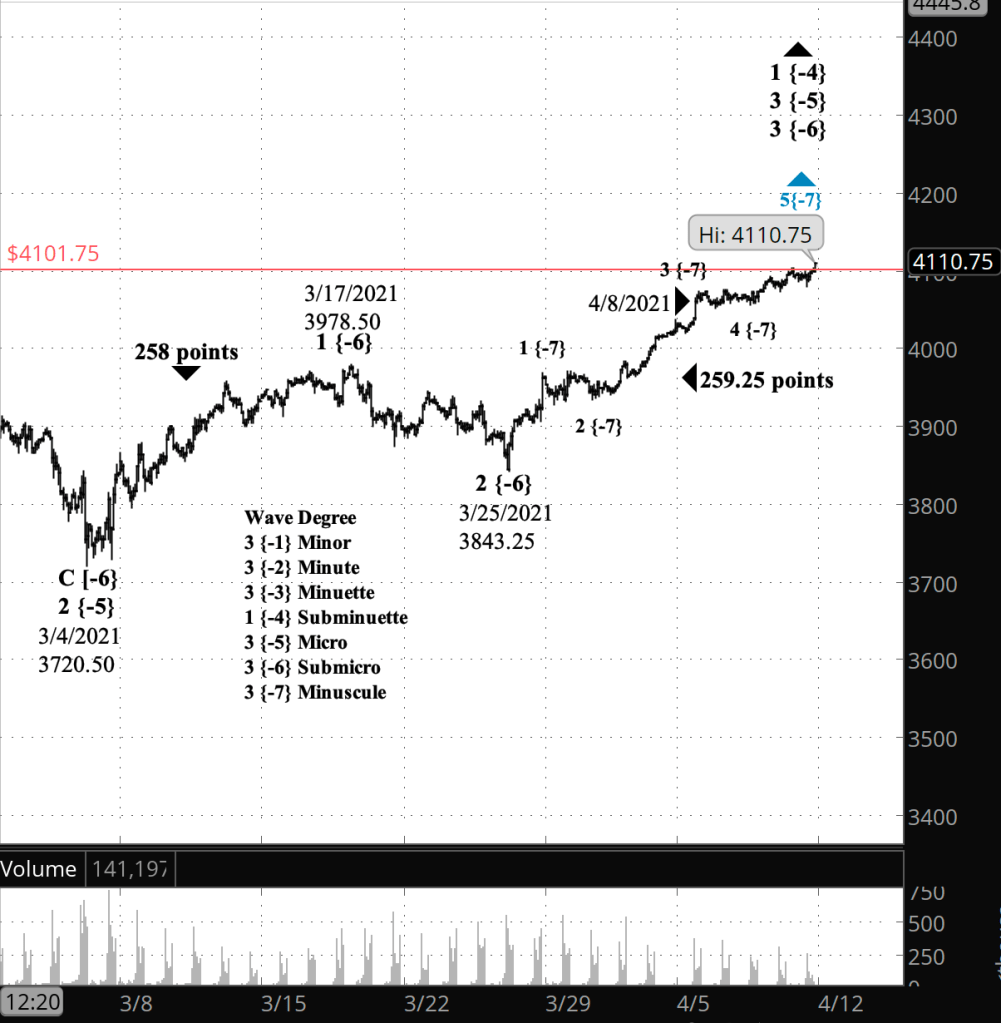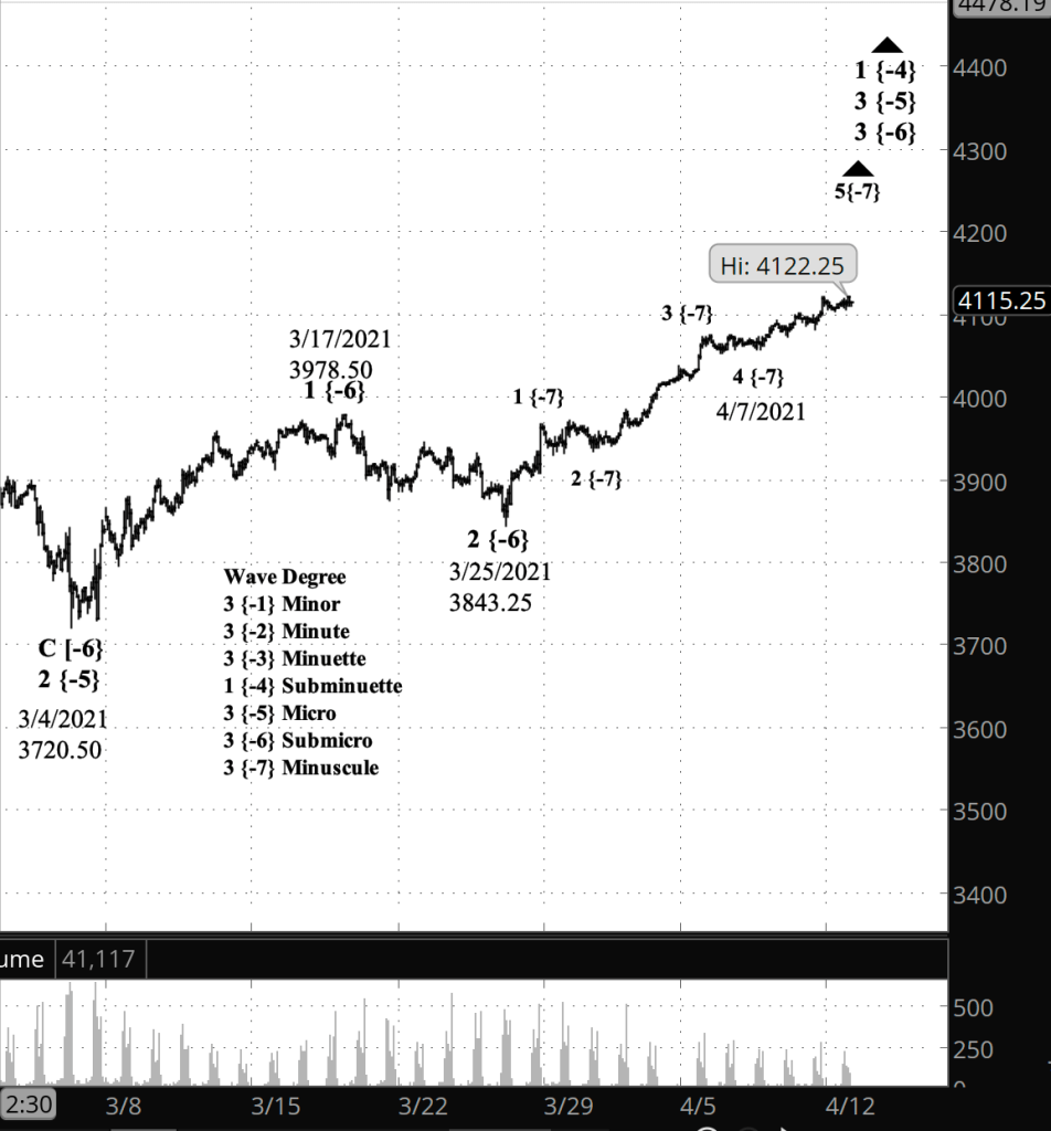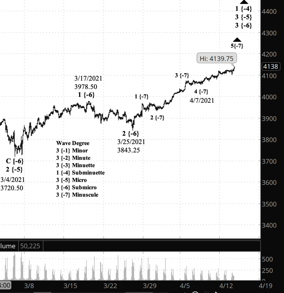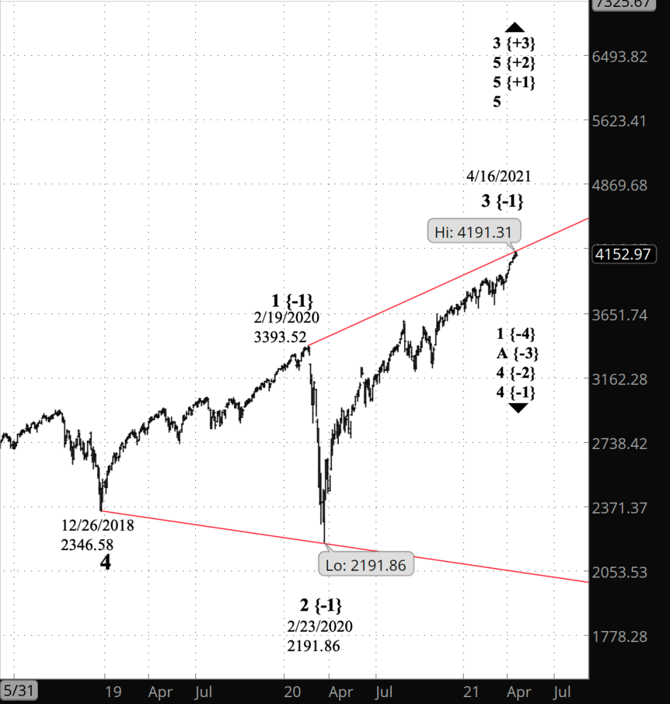 If the price moves above the peak of April 16 (4183.50 on the futures, 4191.31 on the index), and if the rise from April 20 has three waves internally, then the bullish scenario is correct.