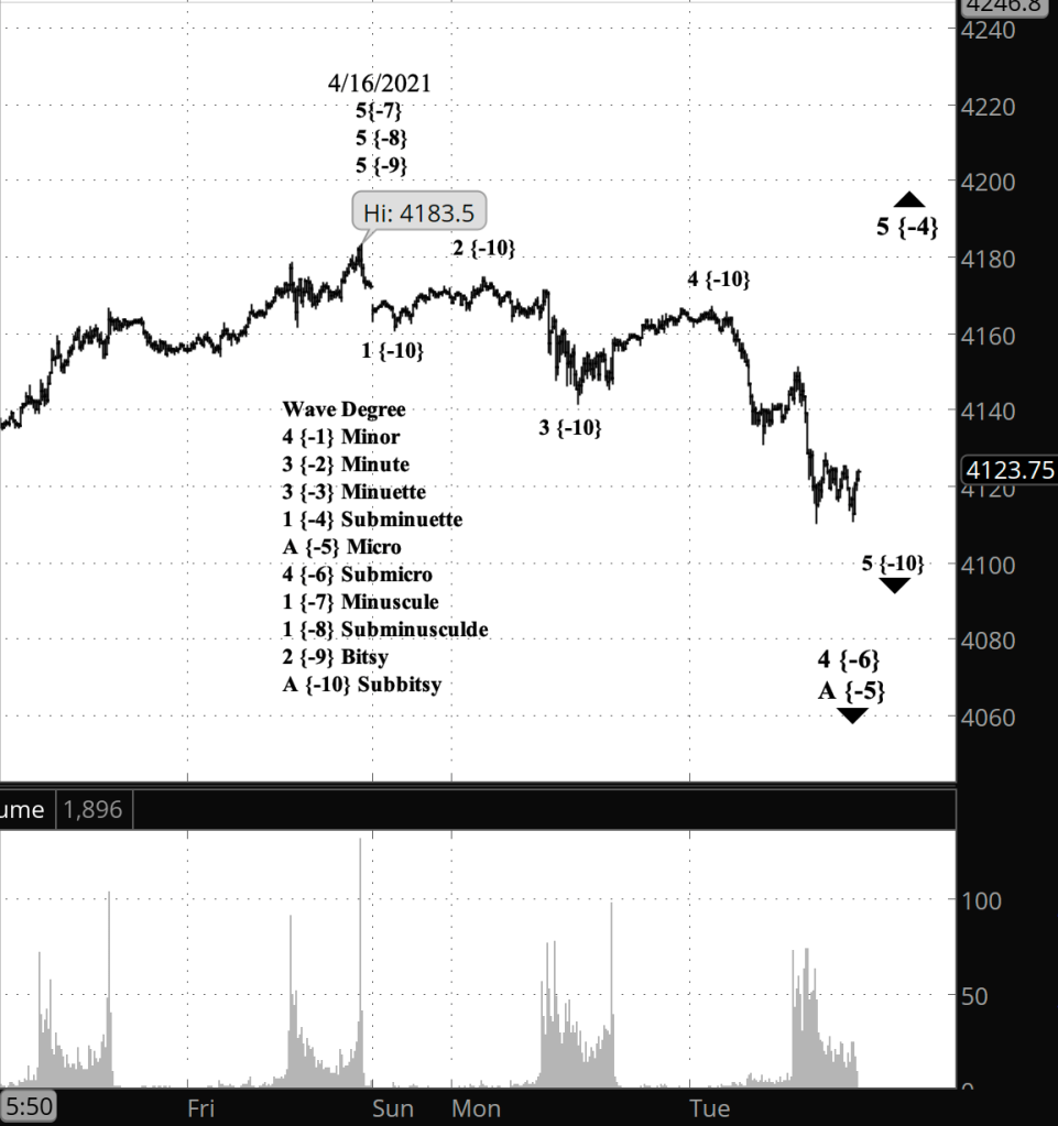 In the bearish scenario, the decline from April 16 is wave 1 of Bitsy degree, and internally wave 1 is complete and wave 2 is underway and nearing completion. Bitsy wave 2 will be followed by a further, more energetic decline.