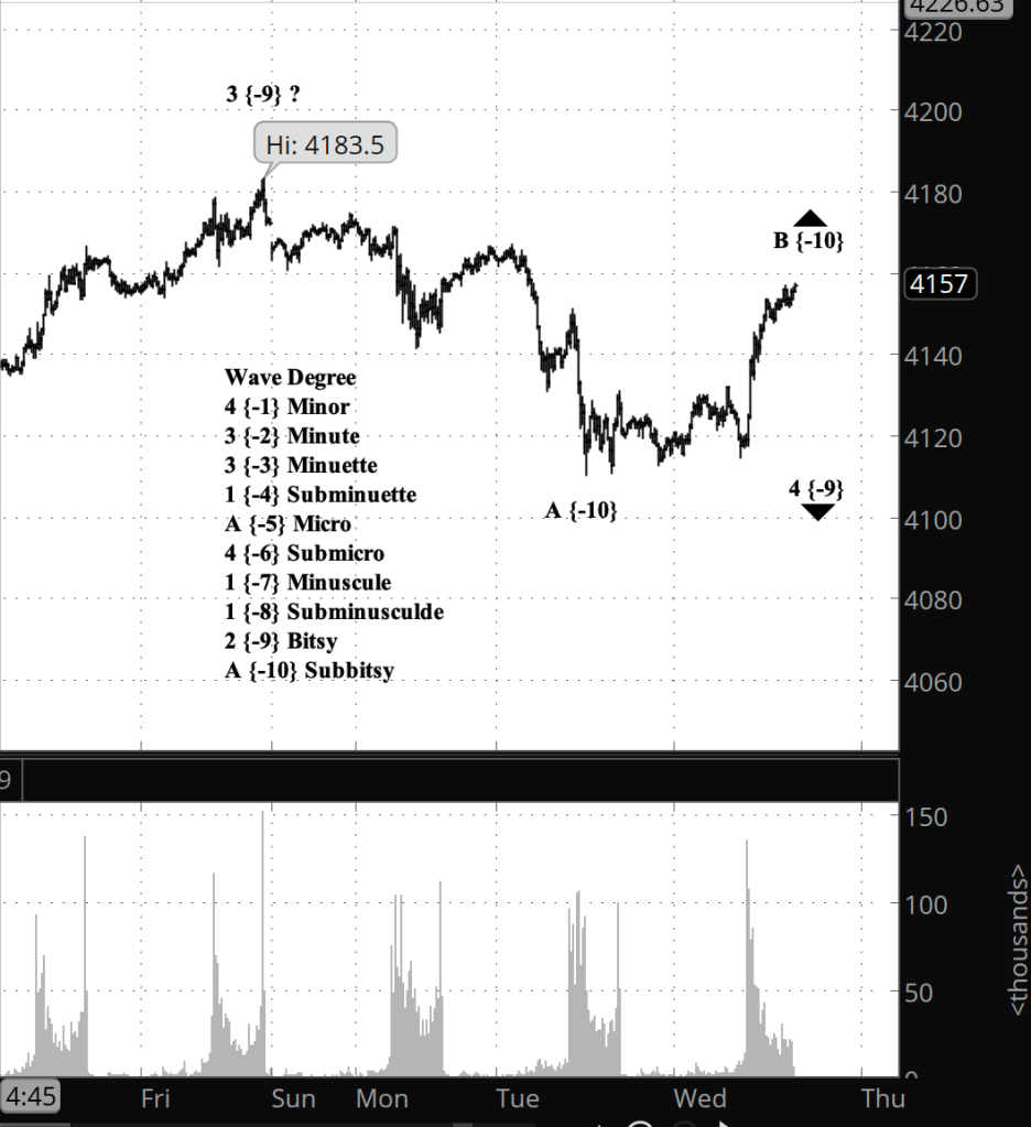 What does Elliott wave theory say? In the bullish scenario, the decline from April 16 is wave 4 of Bitsy degree, and internally wave A is complete and wave B is either in progress or complete. Bitsy wave 4 will be followed by a push to new highs — Bitsy wave 5.