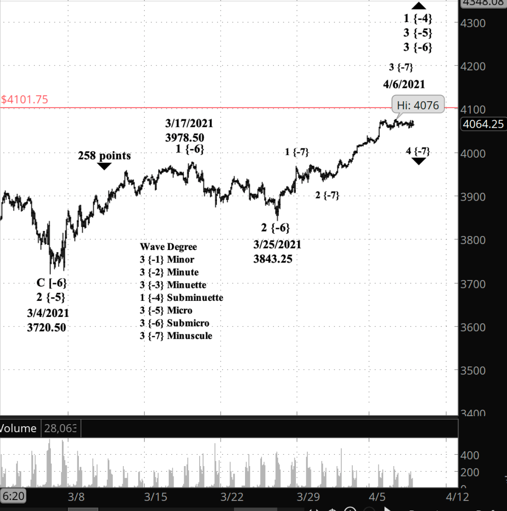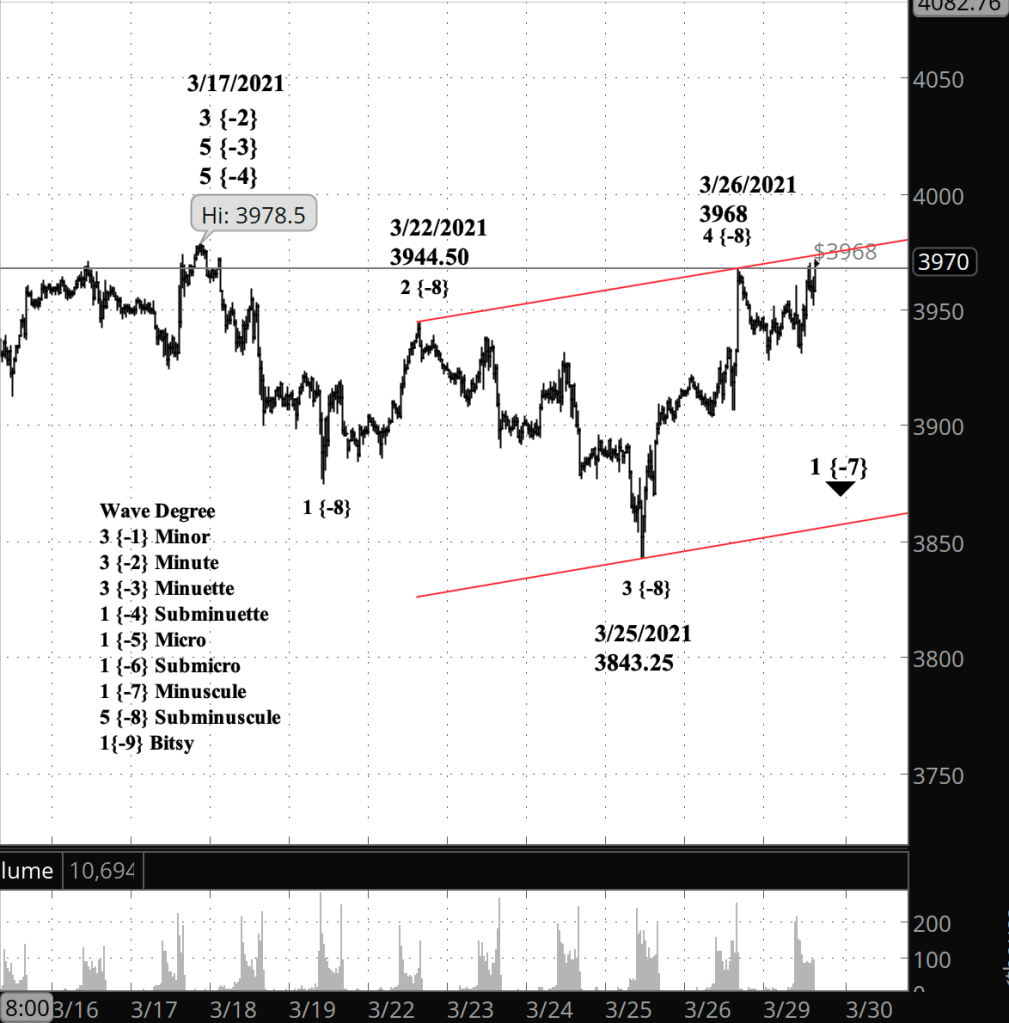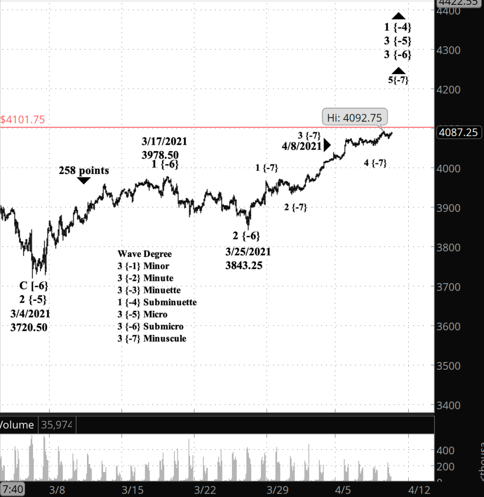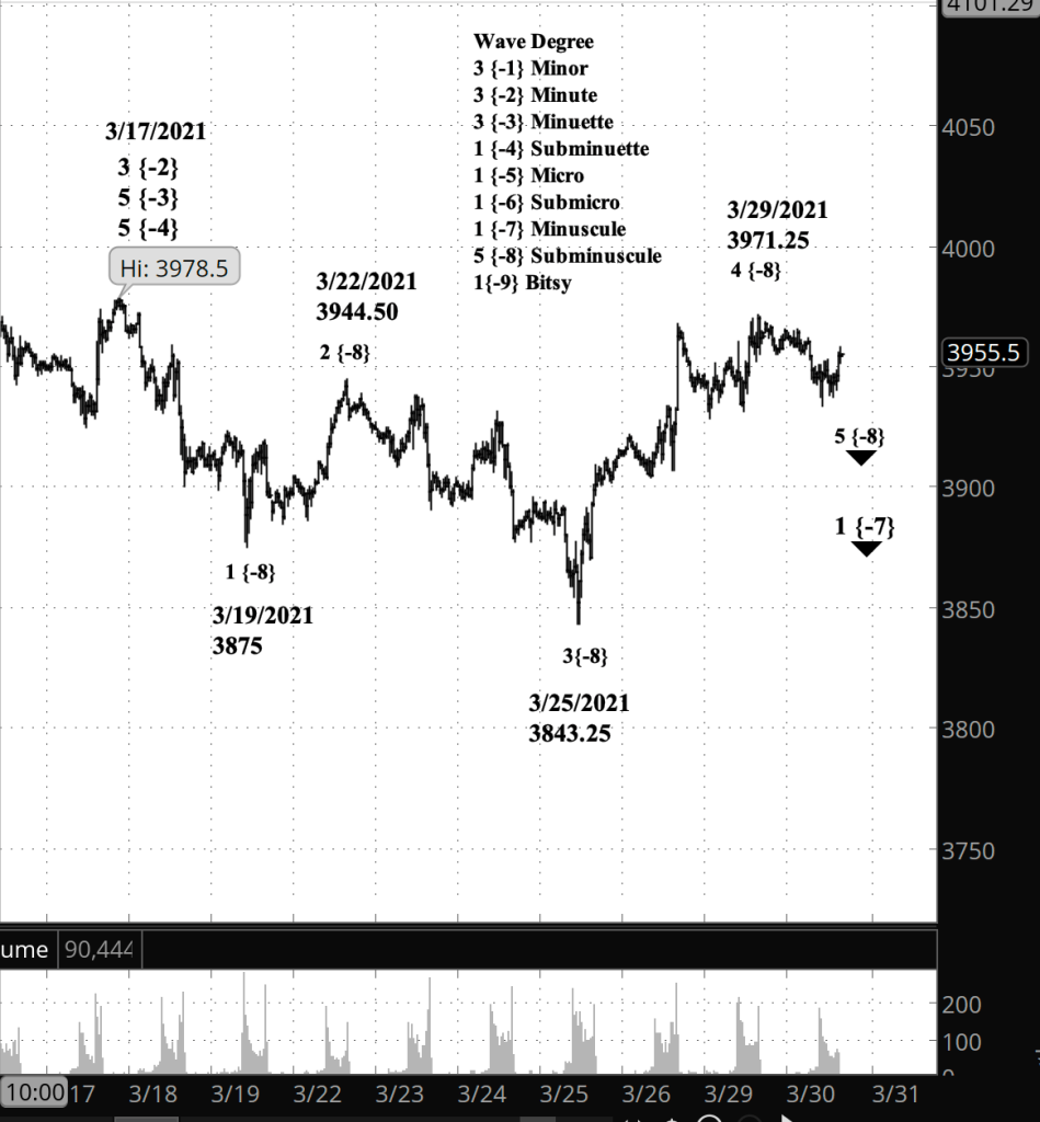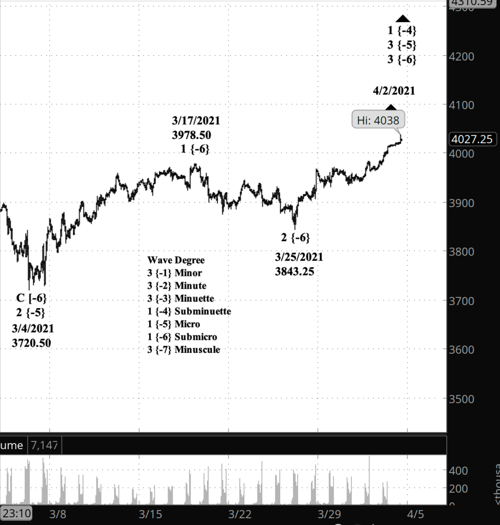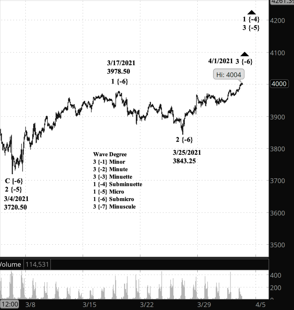 If the price falls below 3843.25, the low of March 25, then then Subminuscule wave 5 is confirmed.