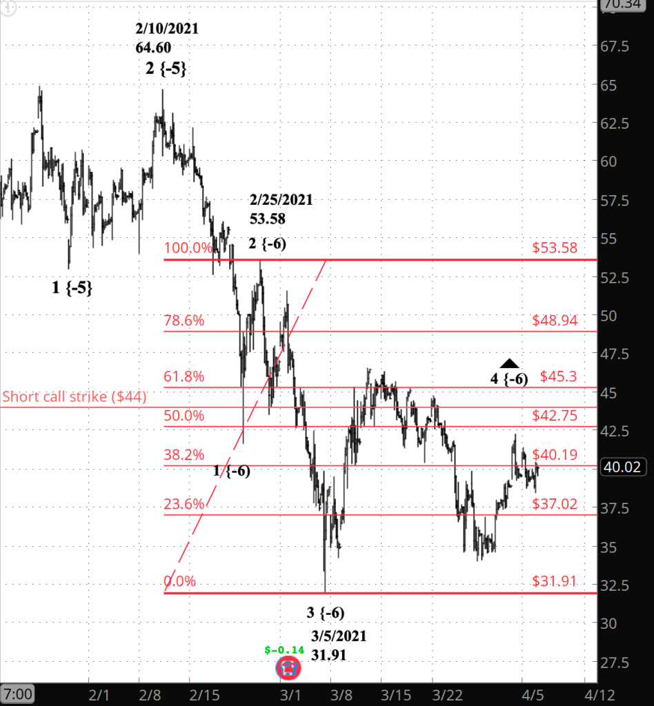 The short call strike price, at $44, is slightly below the start of wave 3, at $53.58. That’s a risk I took to make the premium worthwhile, and with a 45-day lifespan there should be ample opportunity for any move above that to level to reverse back into the profit zone, given that my analysis shows the most likely tendency is to the downside.