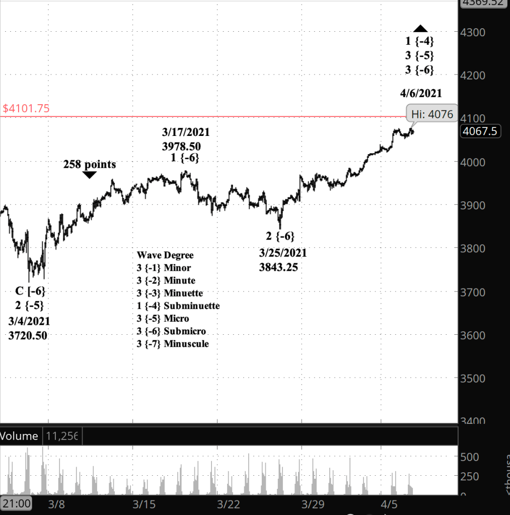 What are the alternatives? If the price should rise above the March 17 peak, then it would invalidate my principle analysis, showing that the uptrend that began in February 2020 is still underway. If the price moves above yesterday’s high, 3971.25 on the futures, then the upward correction that began March 25 is still underway.