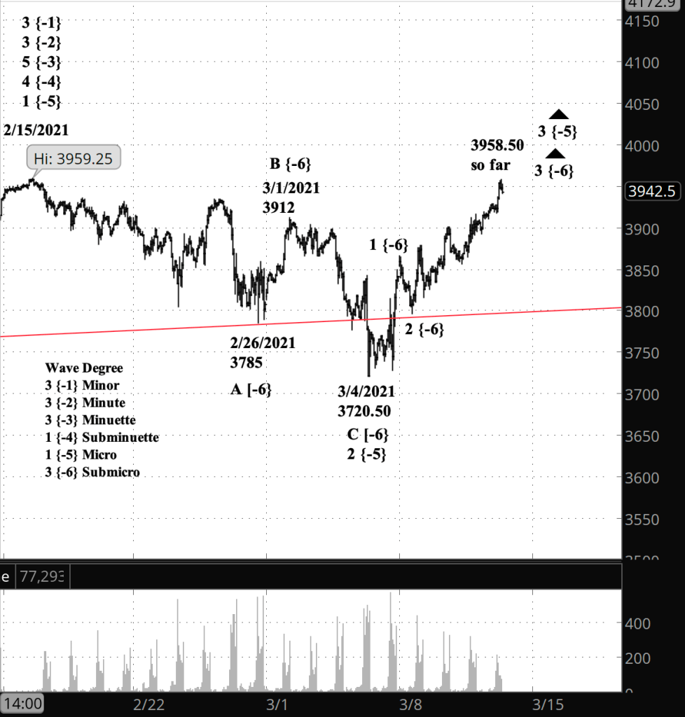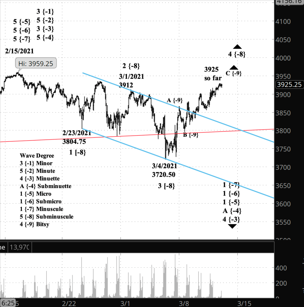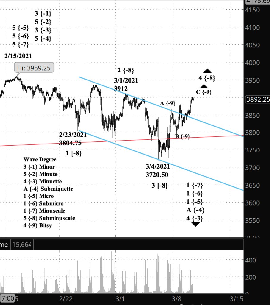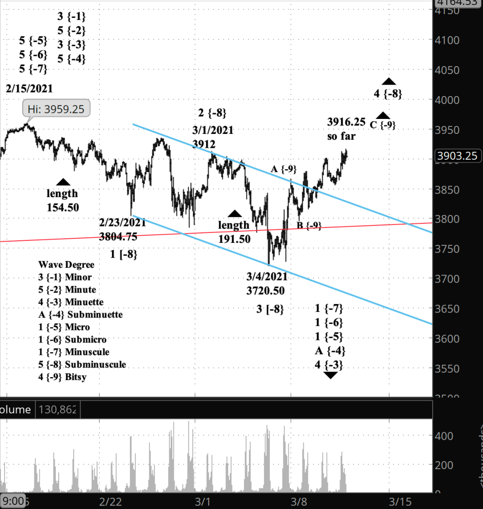 Half an hour before the closing bell. The S&P 500 E-mini futures completed the first very small scale downward movement (an A wave) in a correction that began March 11, and then rose very slightly (a B wave) in a shallow upward movement. The structure is within the 4th wave of Subminuscule degree, which appears to be shaping up as a shallow Flat pattern. I’ve updated the short-term chart, the first of the two charts below.