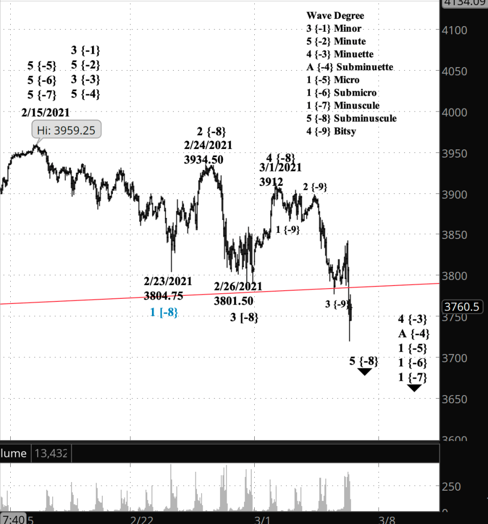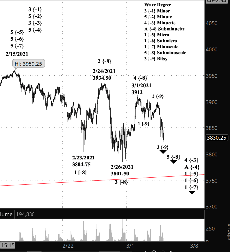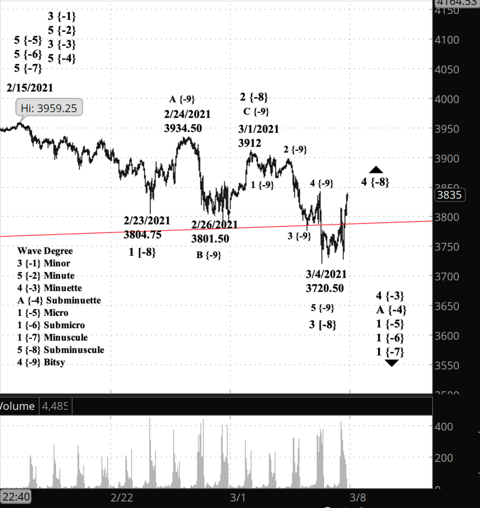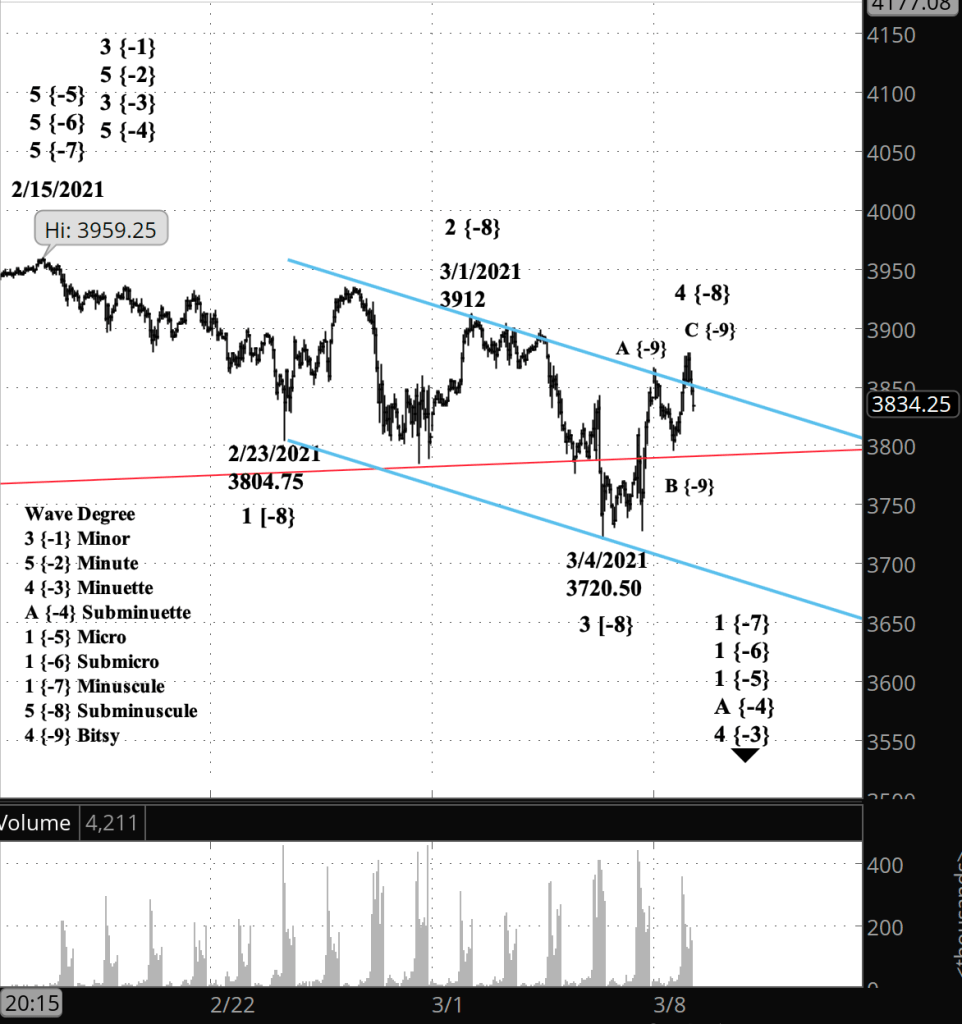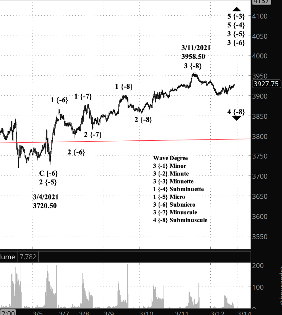 Half an hour before the closing bell. The S&P 500 E-mini futures completed the first very small scale downward movement (an A wave) in a correction that began March 11, and then rose very slightly (a B wave) in a shallow upward movement. The structure is within the 4th wave of Subminuscule degree, which appears to be shaping up as a shallow Flat pattern. I’ve updated the short-term chart, the first of the two charts below.