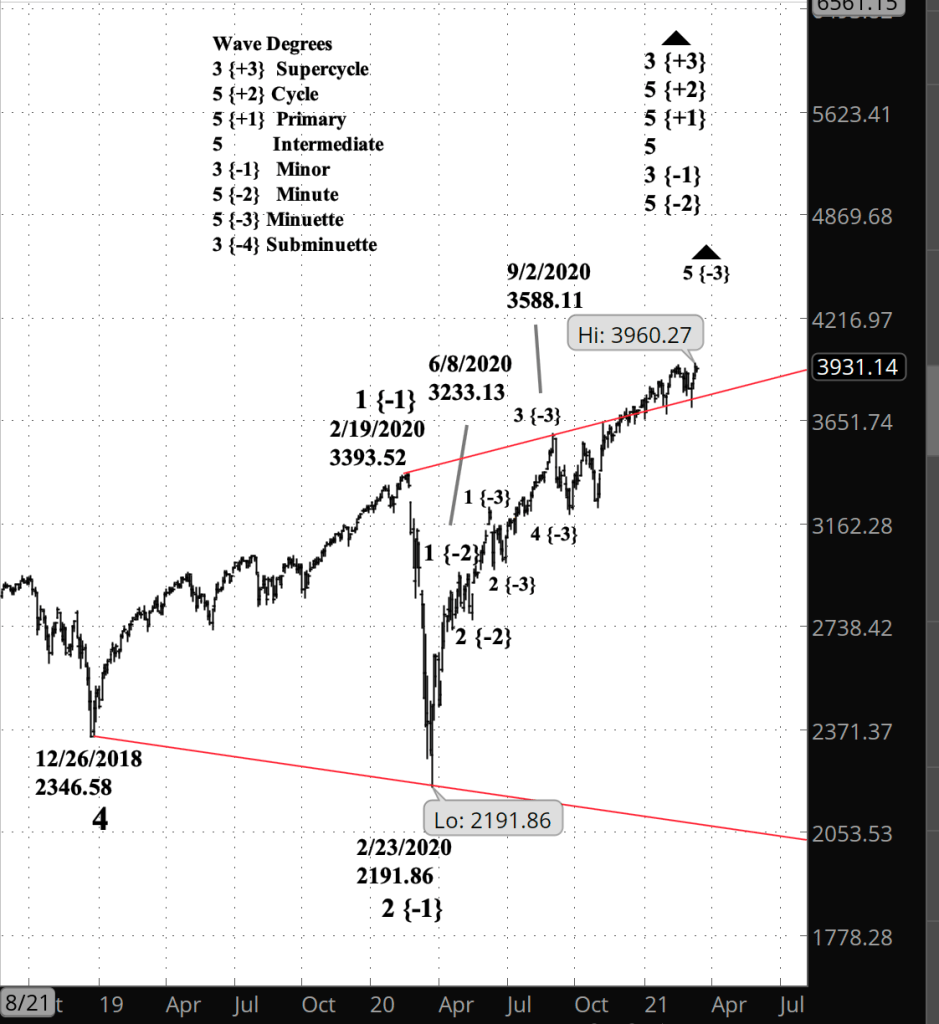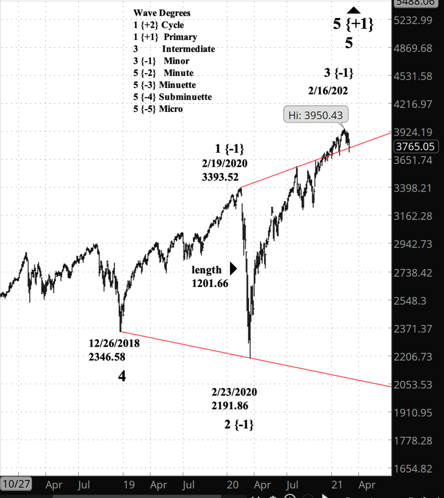 So what does all of that mean for the Expanding Diagonal Triangle that began on December 26, 2018, the red lines on the long-term chart that a reader of Private Trader has aptly described as a megaphone? And the answer is, no impact. The price broke above the upper boundary of the triangle last December and has continued to bounce along the line ever since. The bouncing will end with the completion of wave 3 of Minor degree. The next movement will be wave 4, which by the rules of Elliott wave analysis will eventually reach the lower boundary, presently around 2080 but sinking further each day. If wave 4 instead proves to be a shallow correction, then the analysis that resulted in the Diagonal Triangle will need to be revised.