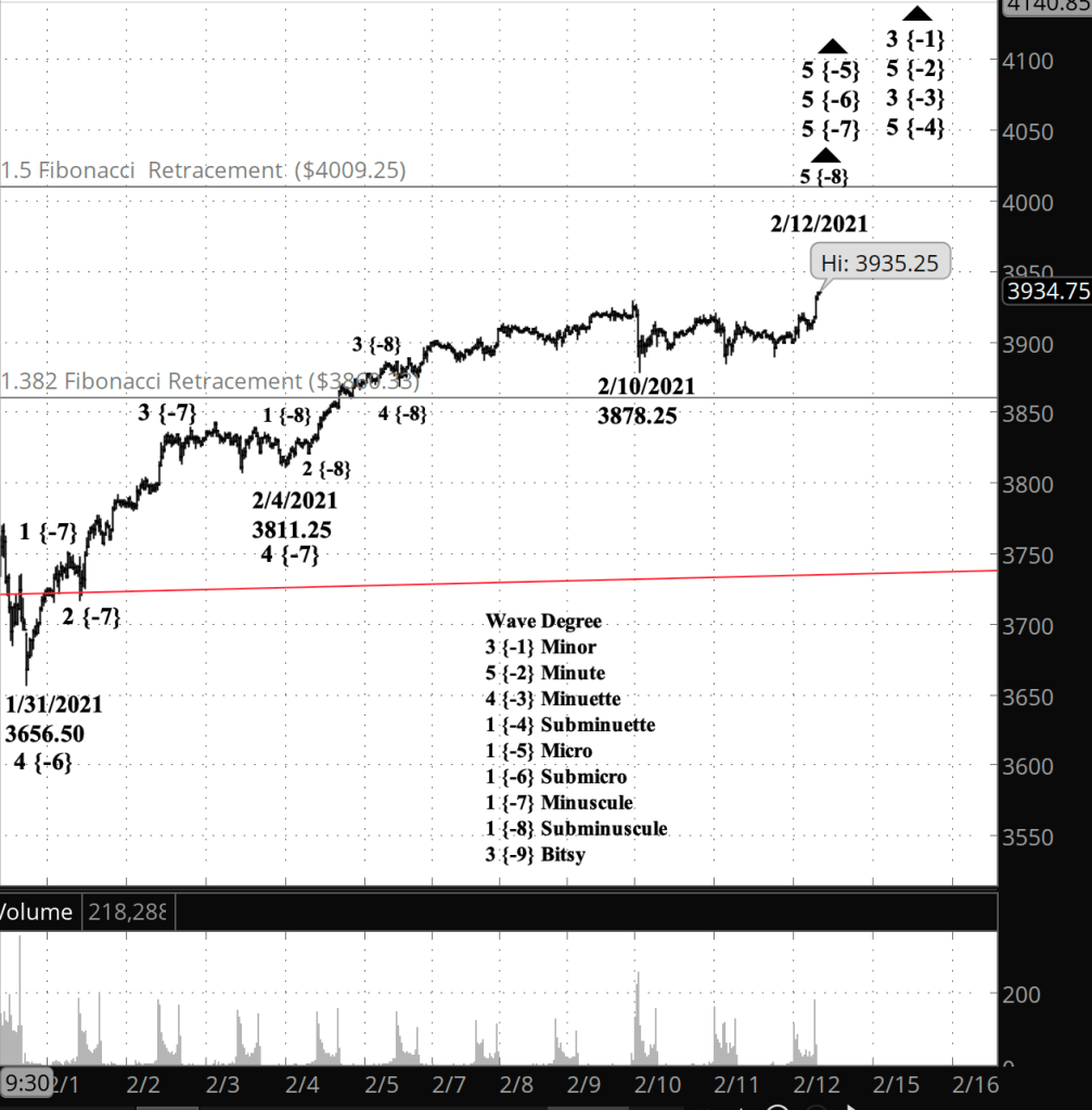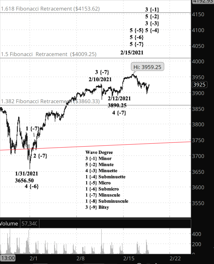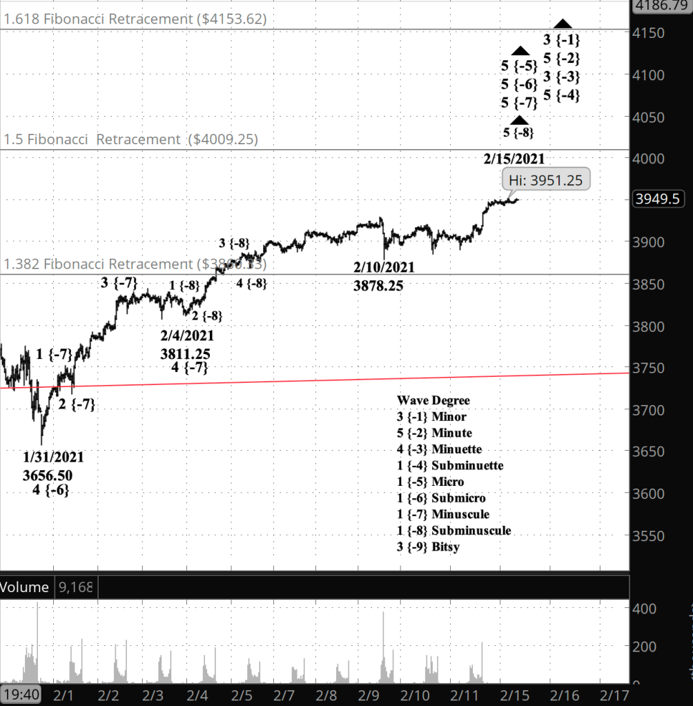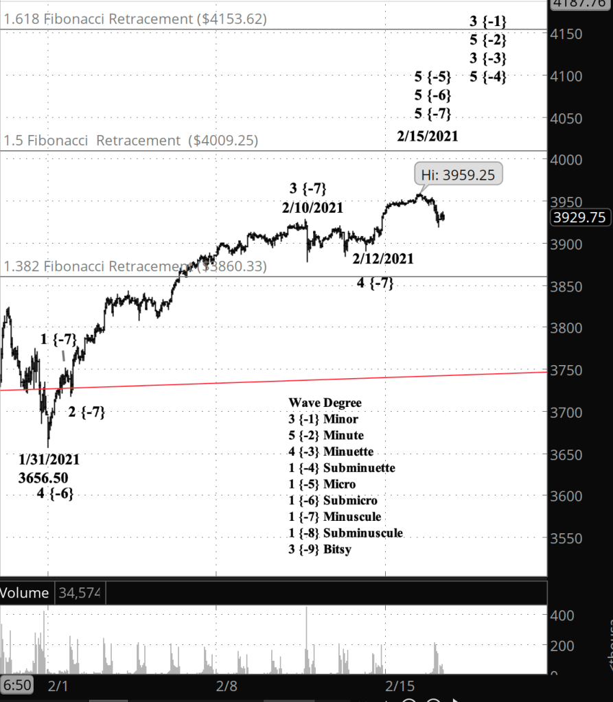 What does Elliott wave theory say? Wave A of Bitsy degree has completed it’s 3rd wave internally and is correcting with wave 4. A final push upward will complete the 5th wave within Bitsy and begin declining Bitsy B, which will remain above the start of A, 3880.50 on the futures. A final wave C of Bitsy degree will push still higher while remaining below the February 15 high and will complete wave 2 of Subminuscule degree. The next move after Subminuscule 2 will be Subminuscule 3, a comparatively powerful wave at this small degree that will push below 3880.50, perhaps by quite a bit.