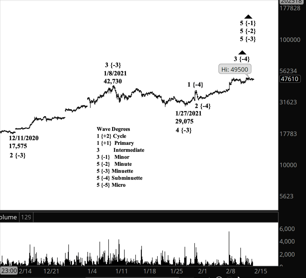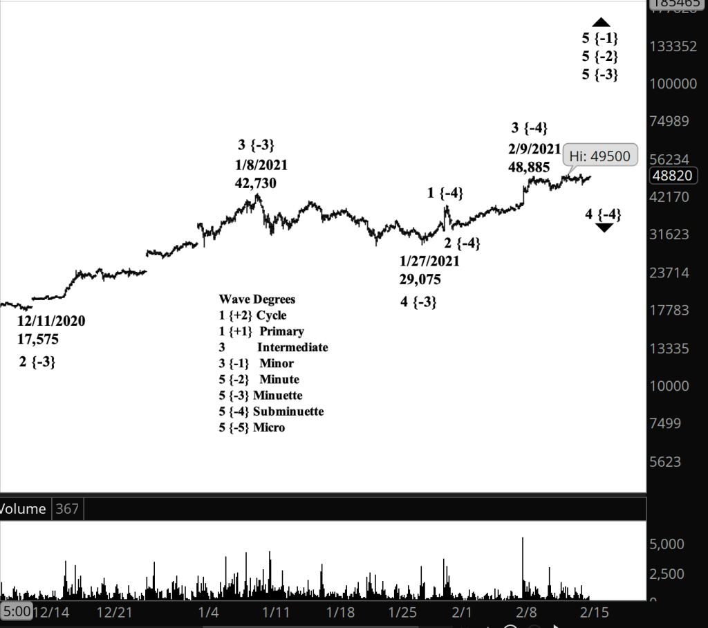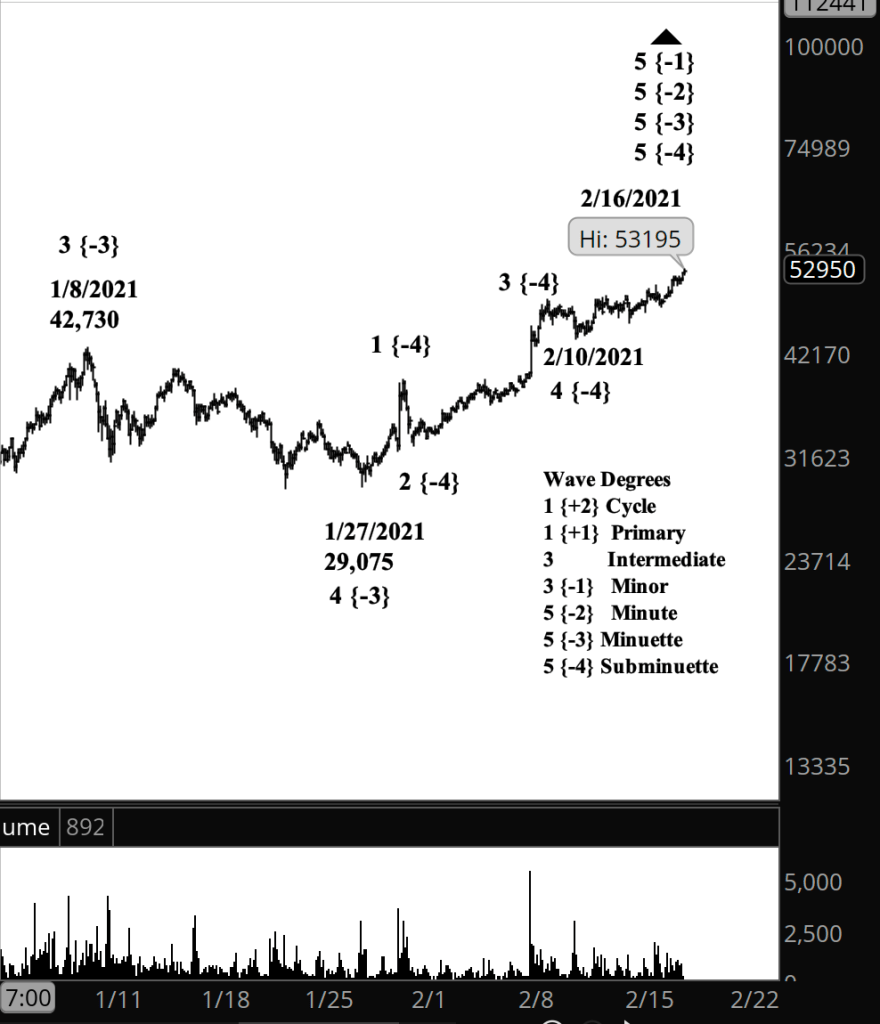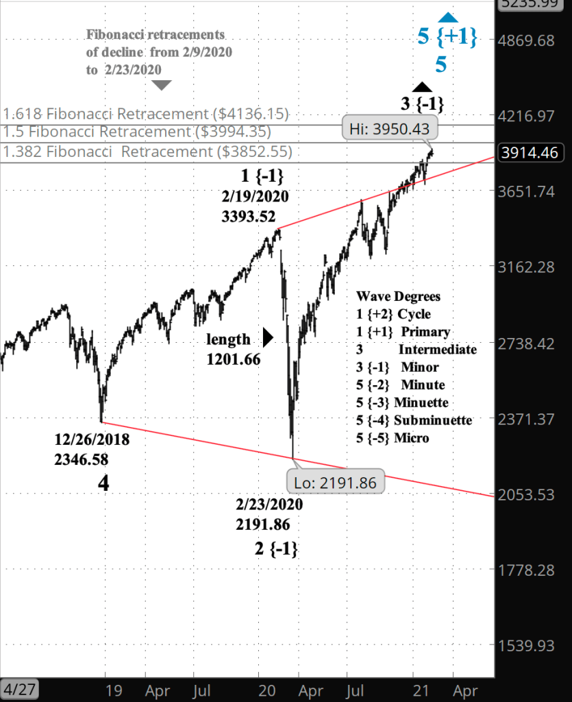 What does Elliott wave theory say? Wave A of Bitsy degree has completed it’s 3rd wave internally and is correcting with wave 4. A final push upward will complete the 5th wave within Bitsy and begin declining Bitsy B, which will remain above the start of A, 3880.50 on the futures. A final wave C of Bitsy degree will push still higher while remaining below the February 15 high and will complete wave 2 of Subminuscule degree. The next move after Subminuscule 2 will be Subminuscule 3, a comparatively powerful wave at this small degree that will push below 3880.50, perhaps by quite a bit.
