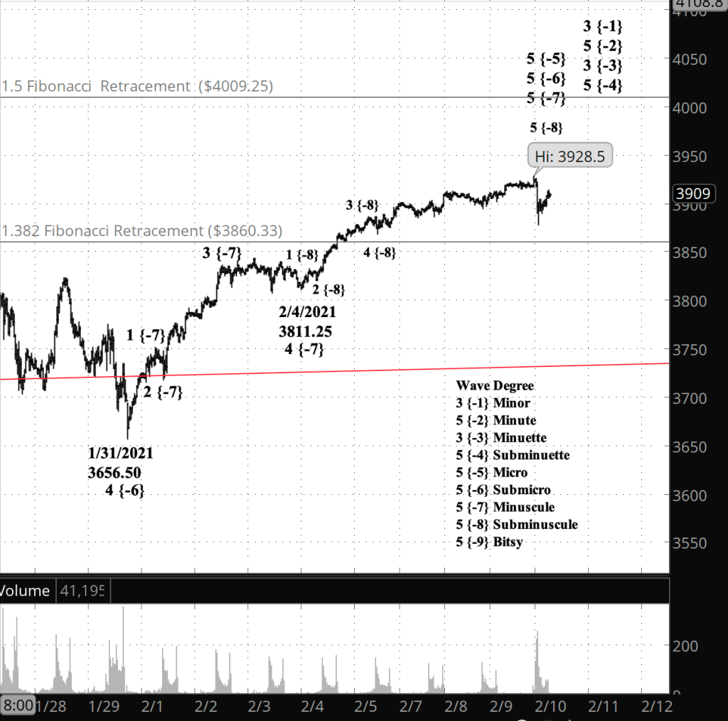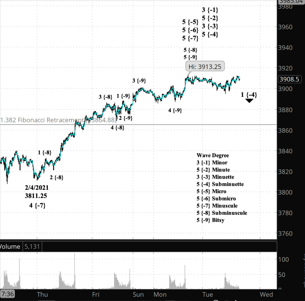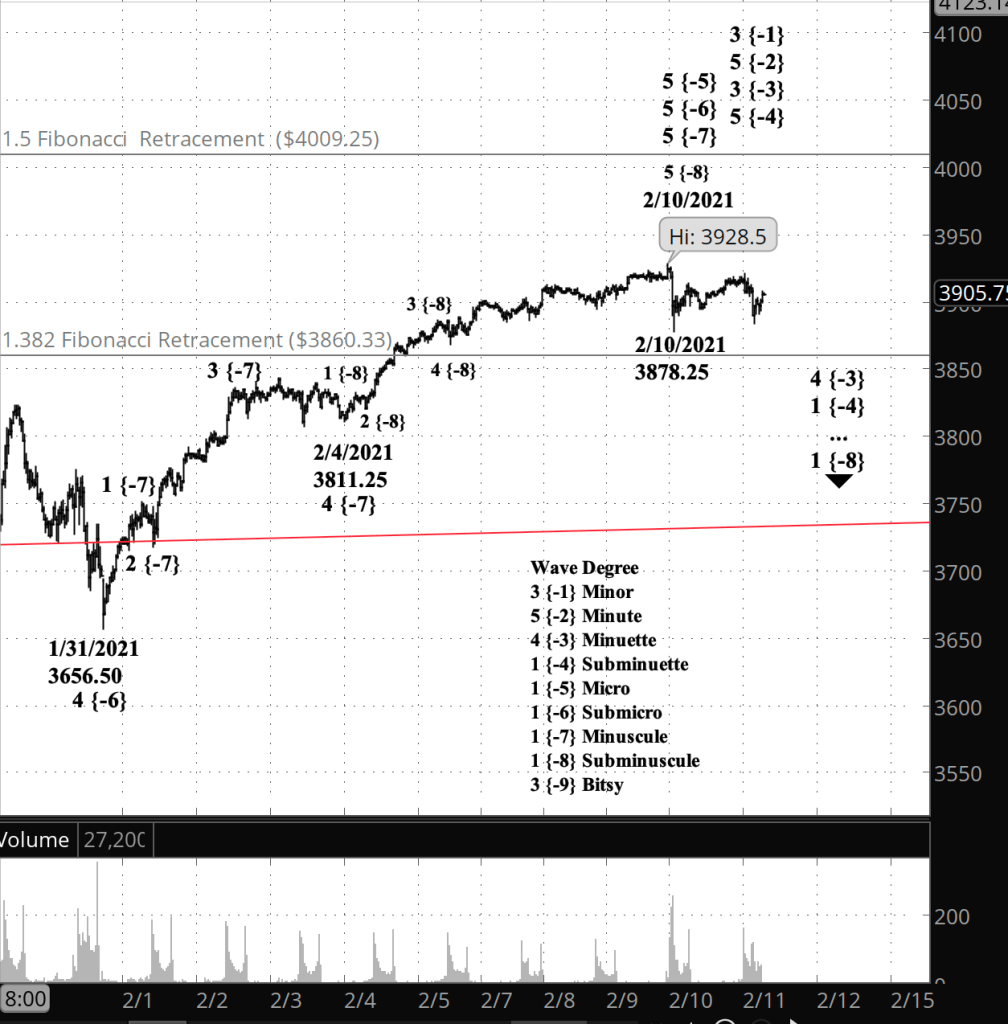 The last half hour. In the last half hour of the regular trading session, the S&P 500 moved to a new high, triggering my alternate analysis. Here’s a chart showing the push up to 3869.75 on the E-mini futures, 3872.42 on the index. I’ve renumbered the waves as follows: The end of wave 4 of Submicro degree moves from January 17 to January 31, and the rise from January 31 is relabelled as wave 5 of Submicro degree, which is still in progress.