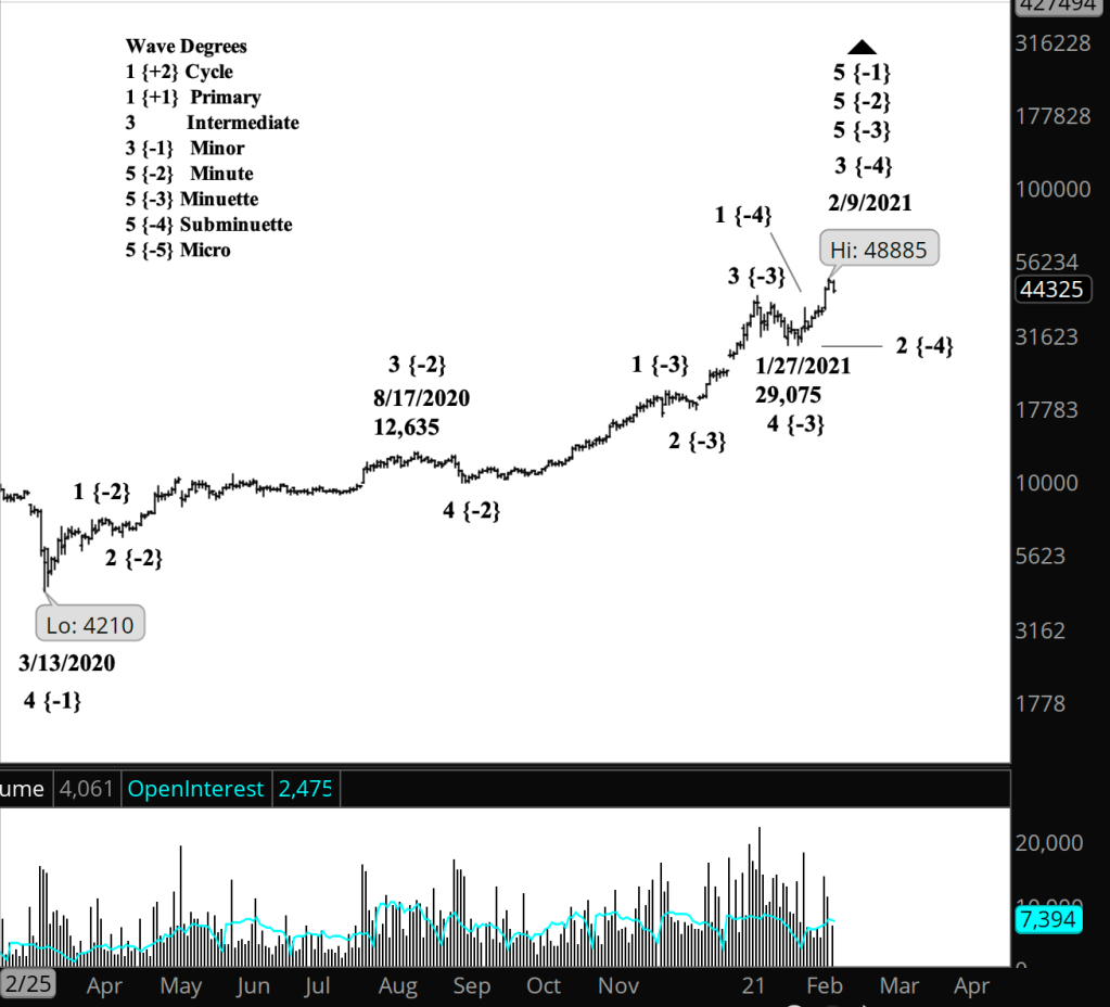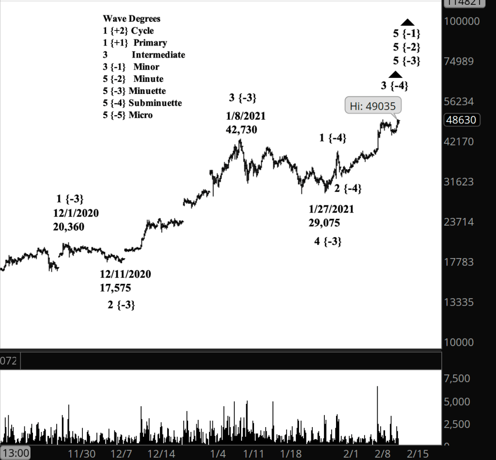 What’s happening now? Bitcoin futures reached a higher high of 48,885 on February 9 and then pulled back. A trader I admire today suggested that the high was a signal to buy Bitcoin.