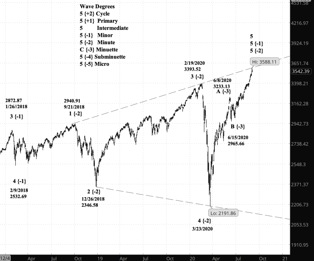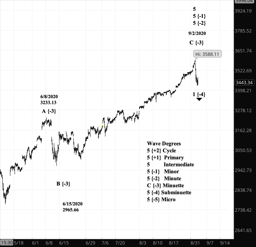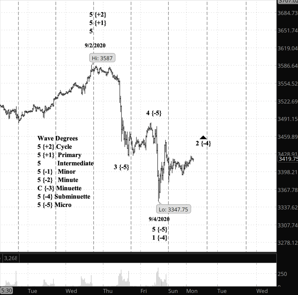 What does Elliott wave theory say? Thursday’s low begins the uptrending wave 2 of Subminuette degree within downtrending wave 3 of Minuette degree. At the Subminuette 2 will end below 3,428.92, the starting point of Minuette 3 and within it, Subminuette 1. A firm rule of Elliott wave analysis posits that a 2nd wave cannot move beyond the start of the preceding 1st wave. Subminuette 2 will be followed by Subminuette 3, which will take the price down to new lows in the decline since September 16