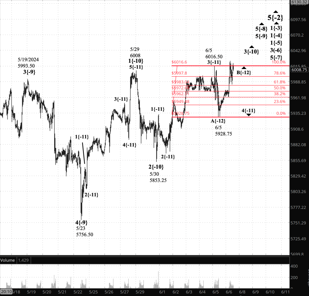 Within wave 5{-9}, its middle subwave, wave 3{-10}, is underway. Internally, wave 3{-10} is in its next to the last subwave, wave 4{-11}, a downward correction that began from 6016.50.