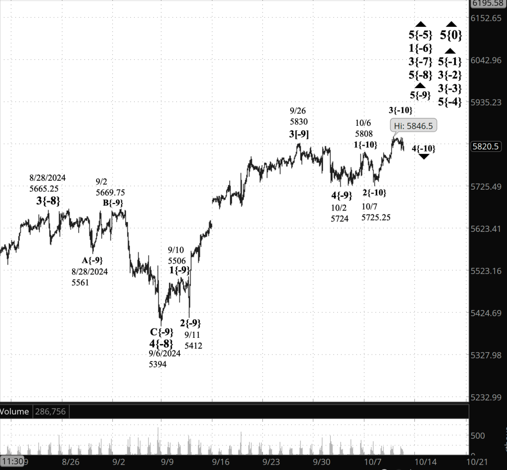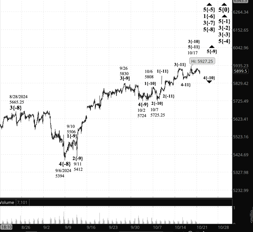 The SP 500 futures fell sharply during the session, coming close to 5800. The 4th-wave downward correction that began on October 17 continues. The wave that will follow, a 5th-wave uptrend, still lies in the future.