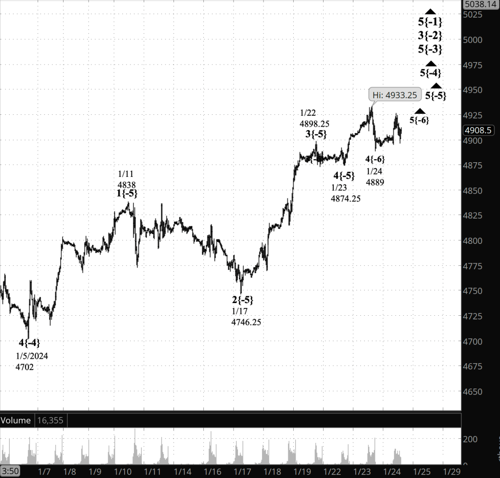 Half an hour before the closing bell. The S&P 500 futures moved higher during the session, to a peak of 4934.25, and then pulled back slightly. The new high gives this morning’s principal analysis an edge over the alternative analysis. It is more likely that the rise that began on January 23 is in its 5th and final subwave. The alternative, that a 4th subwave downward correction is underway, has proven to be less likely. I’ve updated the chart.